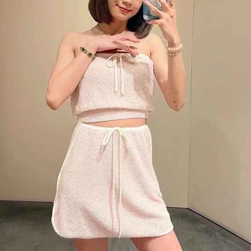 Pink Tube Top Knitted Set Sexy Lace-up Design Waist Sleeveless Tee High Waist Short Skirt Casual Sets For Women
