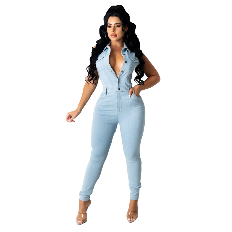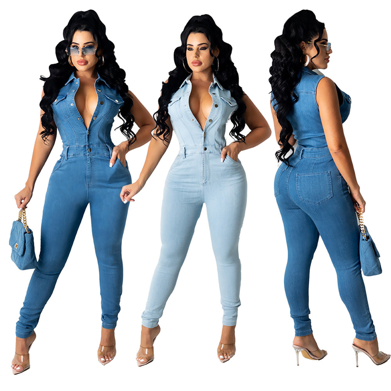 Slim Sleeveless Jeans Jumpsuit Denim Playsuit for Women 2021 with Buttons Cotton Plus Size Elegance Jeans Woman Ladies Overalls