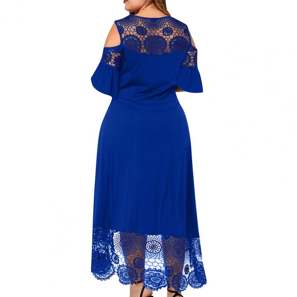 O-neck Flare Short Sleeve Cold Shoulder High-Waist Plus Size Women Dress Embroidery Lace Patchwork High-low Hem Women Dress Party Outfit