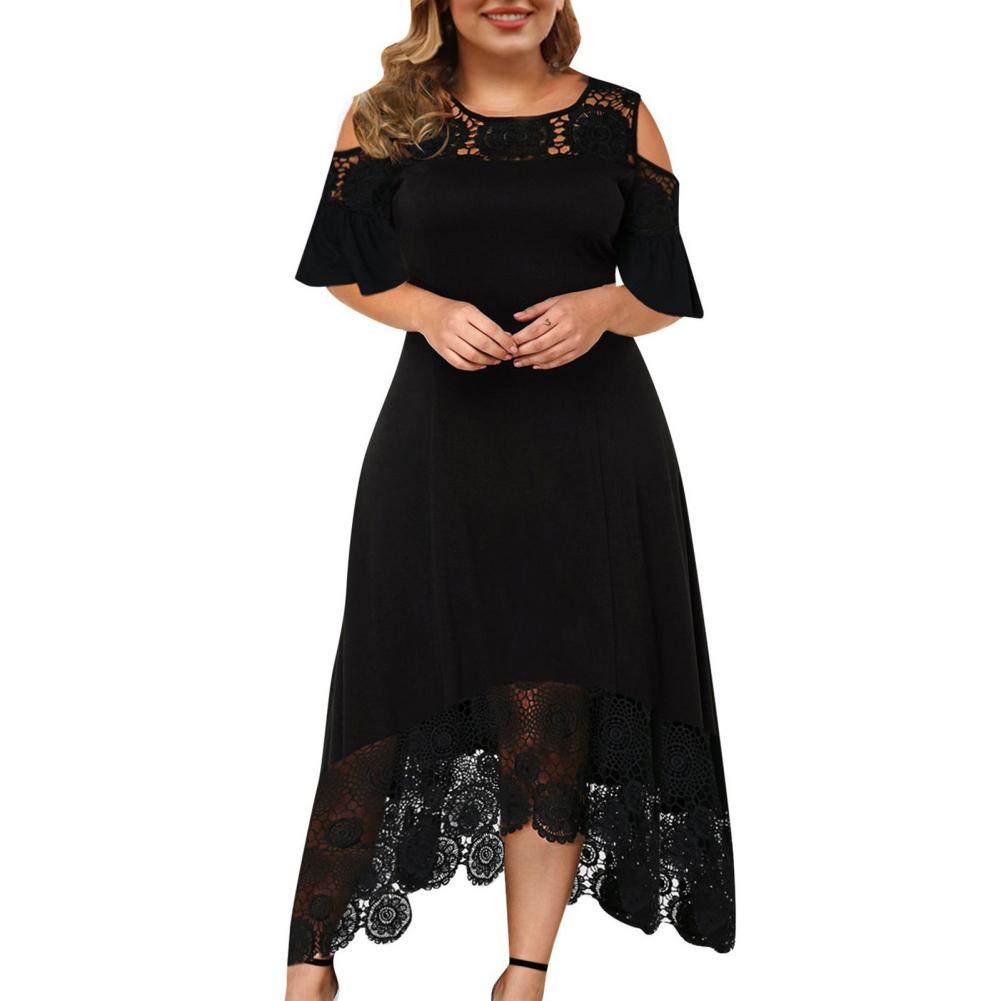 Plus Size Women Dress Flare Short Sleeve Cold Shoulder Embroidery Elegant Dress Party Lace Patchwork High-low Hem Dress Summer