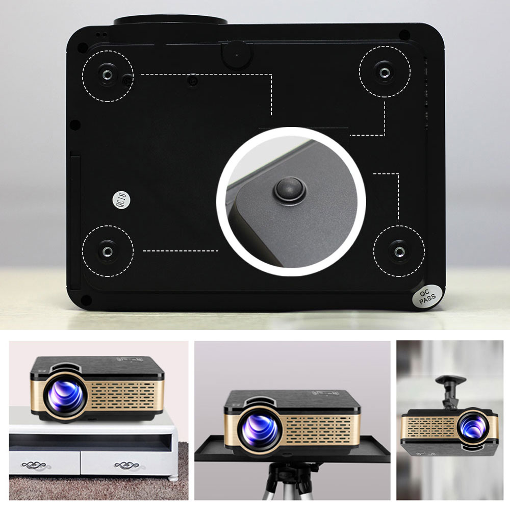 REAL TV W5 projector also supports ceiling installation and tripod mounting. There are 4 holes on the bottom of the overhead projector and it can be mounted to ceiling