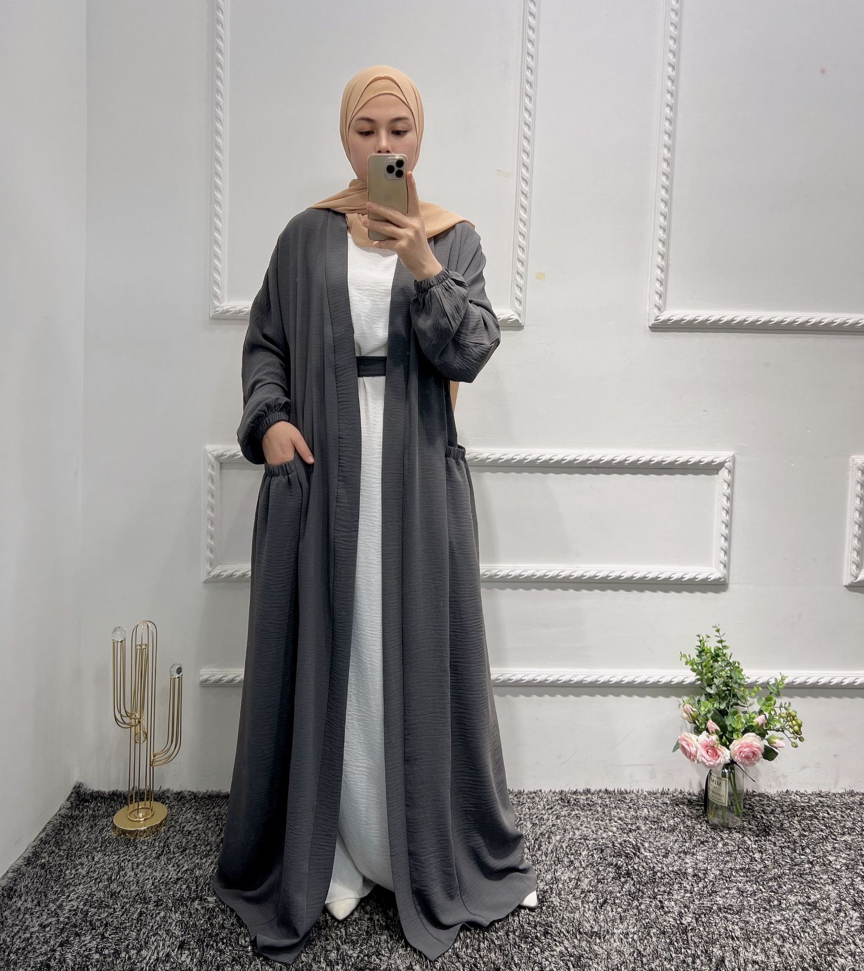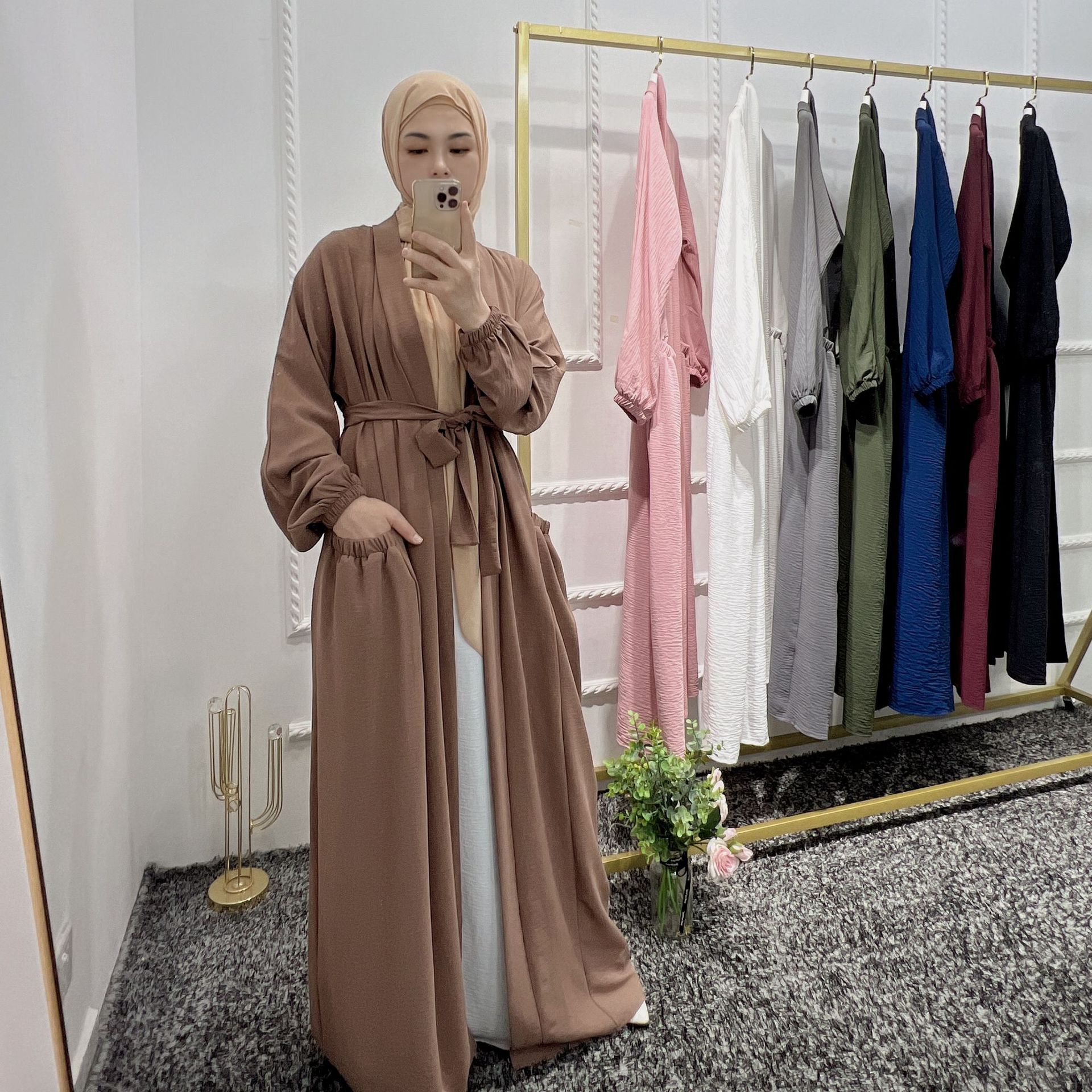 Ramadan Eid Middle East Plain Clothing Abaya Dubai Turkey Muslim Kimono for Women Arab Islamic Robe Cardigan with Pocket Femme
