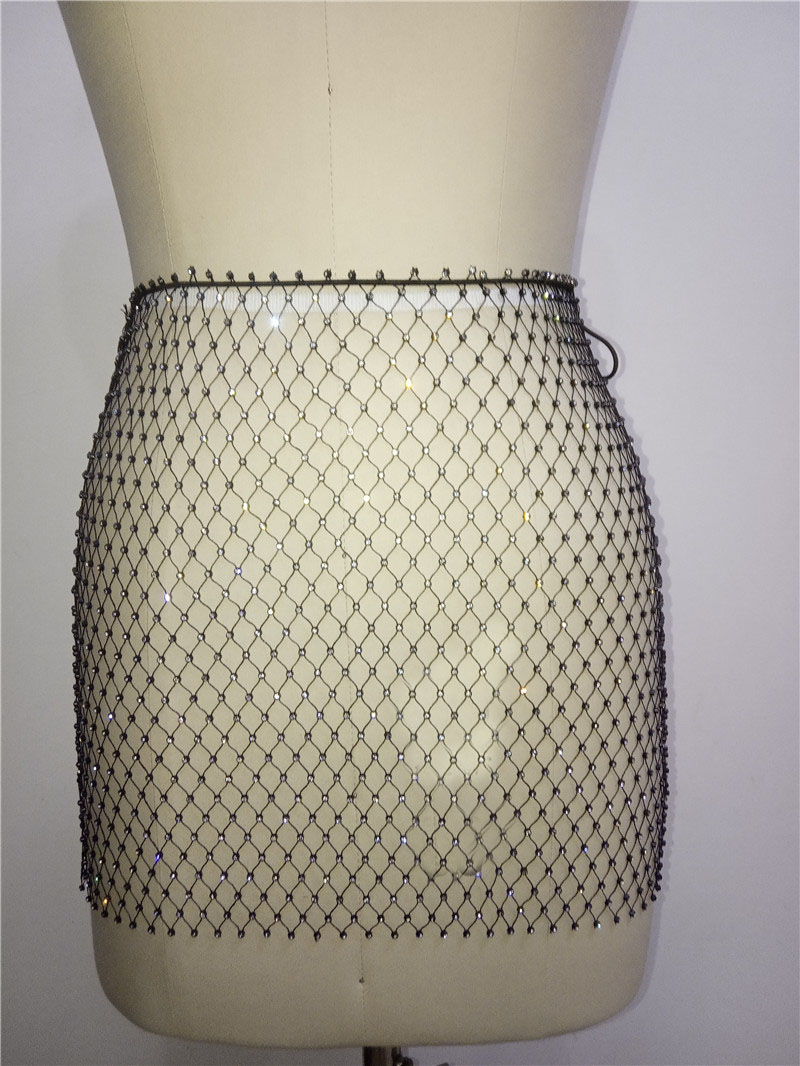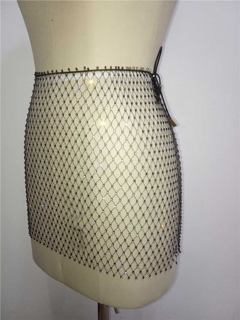 Rhinestone Fishnet Mini Skirt Women Hollow Out Summer See Through Sexy Clubwear Bikini Cover Up Beachwear