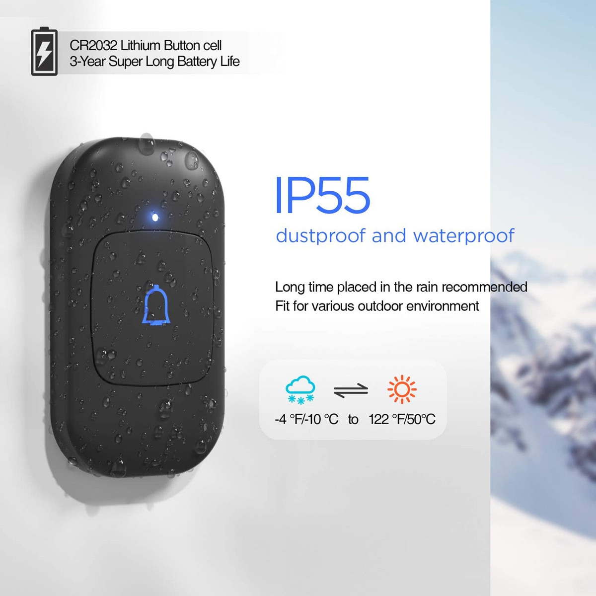 IP55 dustproof and waterproof, which is higher than ordinary doorbells,withstand various harsh weather conditions(Works between 14°F to 122°F), it is suitable for different areas of different climates.