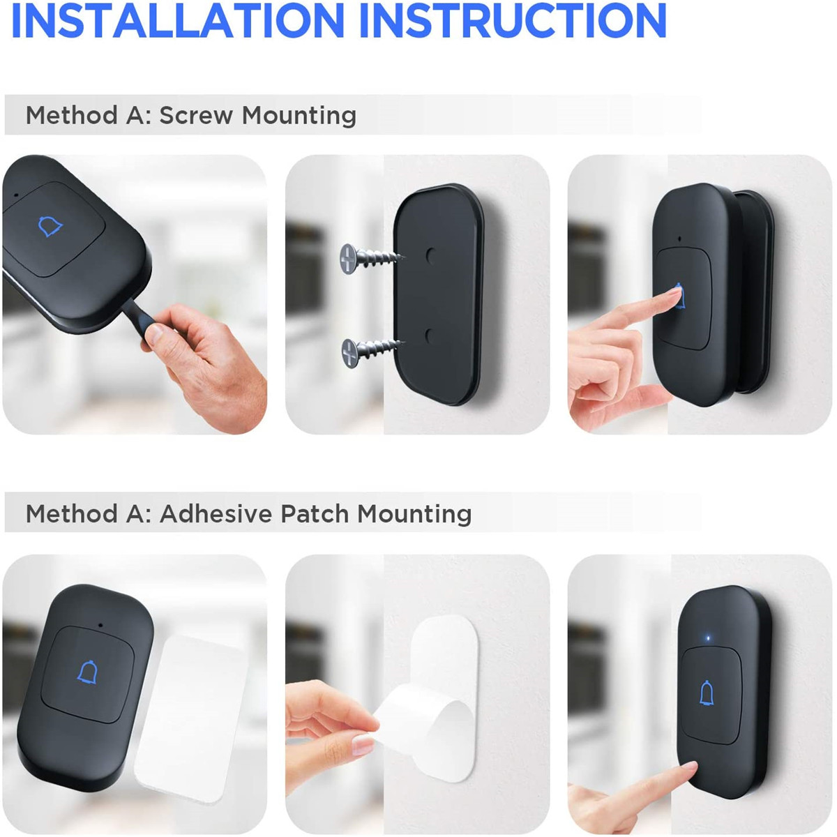 Choose from two simple installation methods: fasten the doorbell push button to your wall with the adhesive patch or fasten it with the screws supplied. All the required accessories are included in the package for an effortless installation.