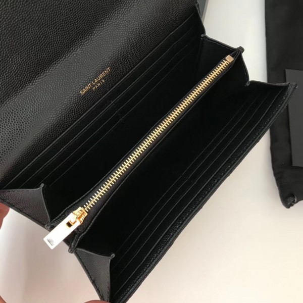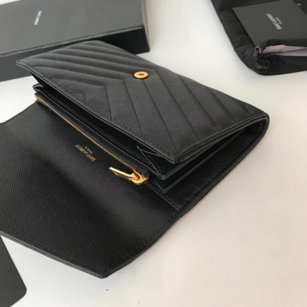 Indulge in this Saint Laurent large monogram wallet wallet to add the Parisian label’s hard-edged opulence to your ensemble. Crafted from grain de poudre embossed leather, this design features multiple card slots and a zipped interior compartment, perfect for securely storing your valuables. The chevron patterned luxurious quilting is punctuated by the iconic ‘YSL’ logo, reflecting the label’s timeless appeal.