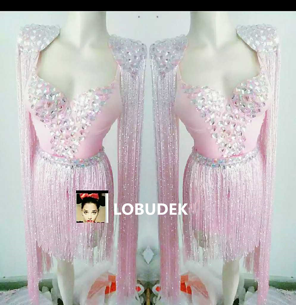 Sexy V-Neck Rhinestones Pink Blue Fringes Epaulet Bodysuit DJ Singer Nightclub Costume Elastic Tassels Catsuit Women Stage Wear