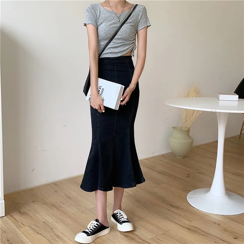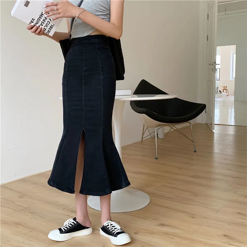 Sexy Retro Mid-Calf Trumpet Skirts : Vintage Denim Trumpet Skirts