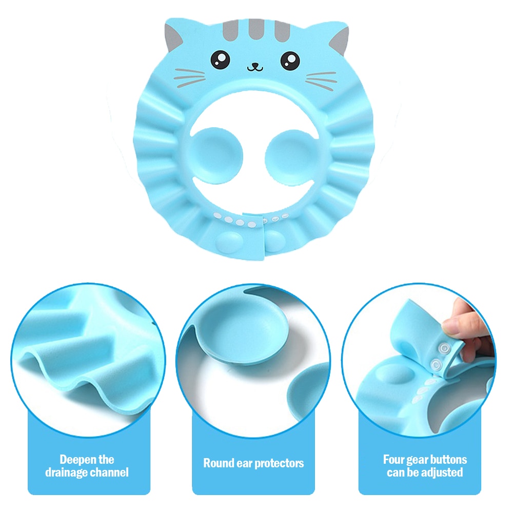 Because the material of the shampoo hat is elastic, so don't worry about squeezing the baby's head. It has 4 buttons, please compare the baby's head first, determine the button to use and then push the buttons. Use it from top to bottom, then buckle down and pull down evenly, don't pull hard, adjust the hair and ears, you can use it.