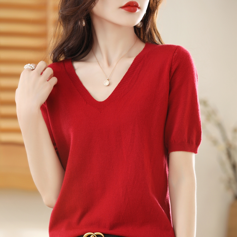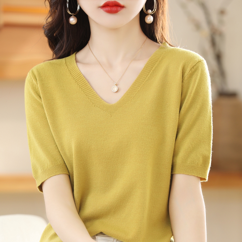 Slim V-Neck Knitted Sweater Tops Women's Summer All-Match Bottoming Shirts With T-Shirts Short Sleeves Large Size