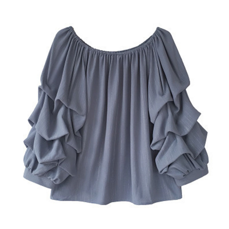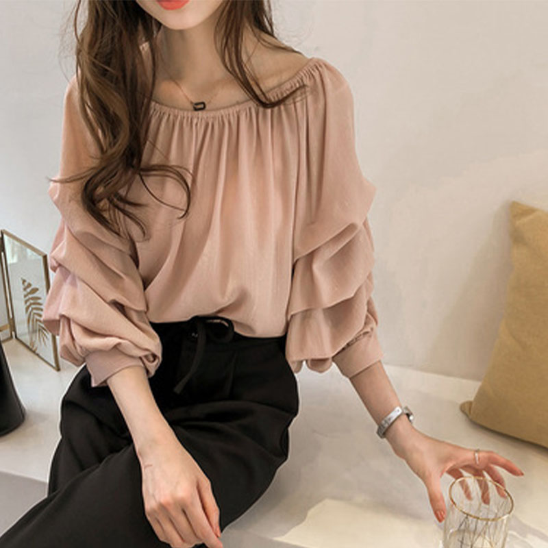 Spring Pile Up Sleeves Loose Blouses Solid Color Sweet Female Elastic Round Neck Casual Shirt Women's Clothing