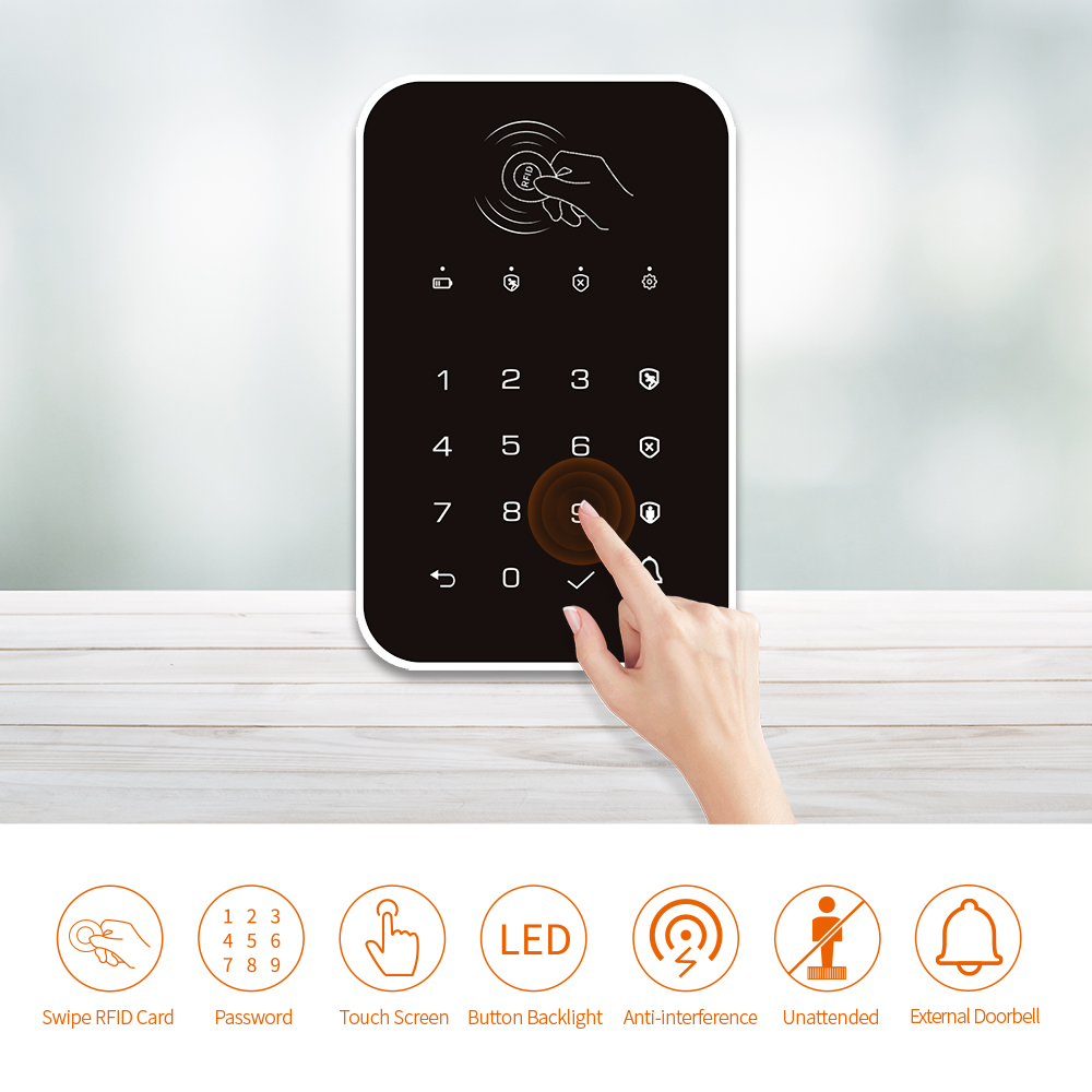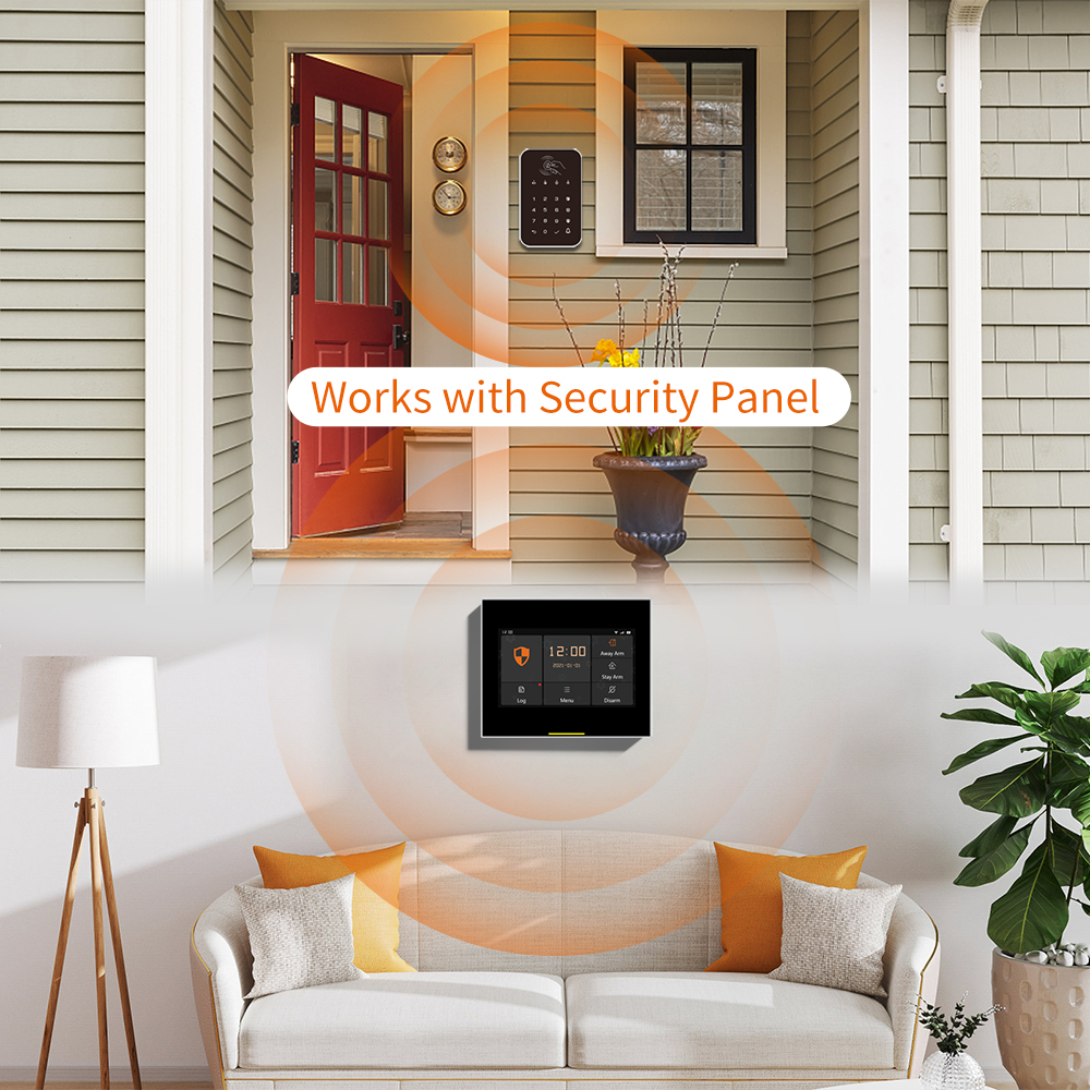 The Wireless keyboard can be connected to the 433MHz frequency encoding method EV1527 alarm host to work, and arming and disarming can be realized.