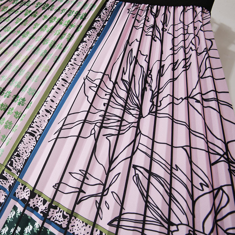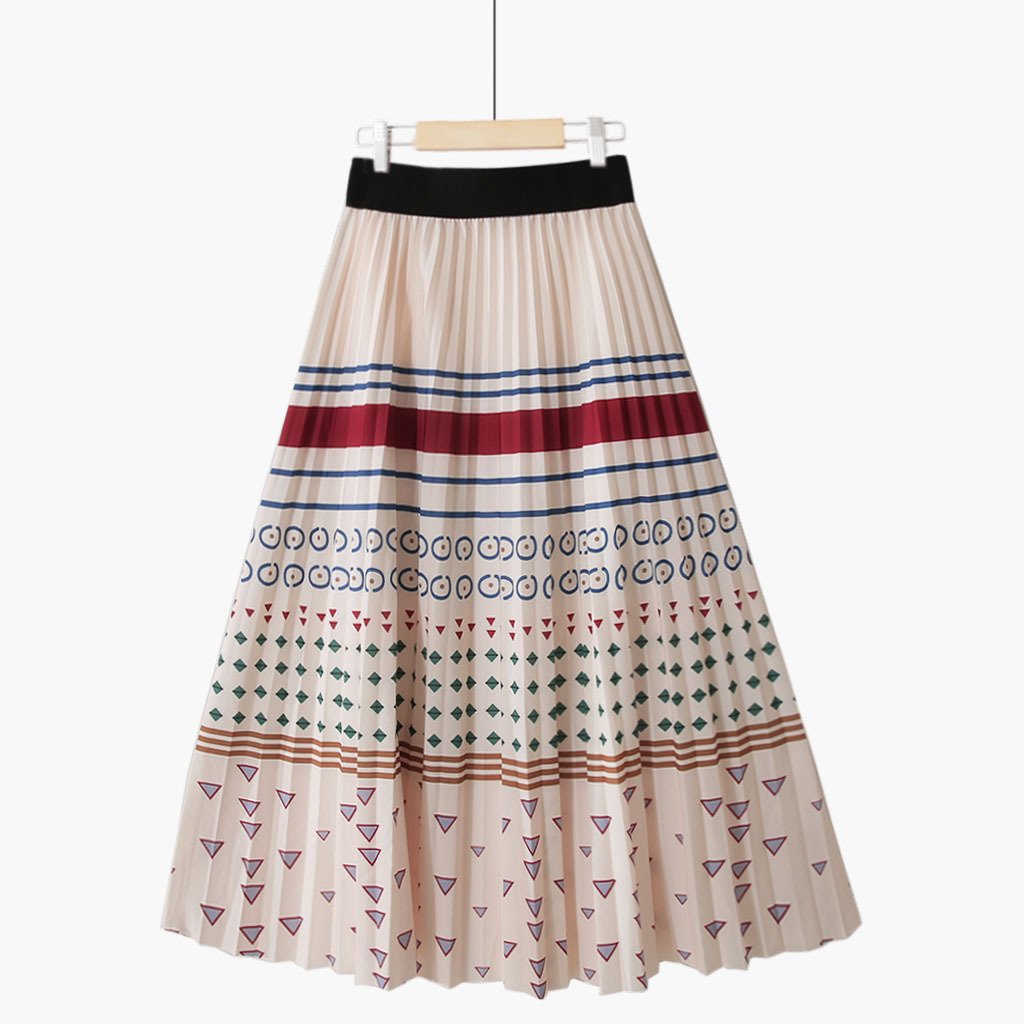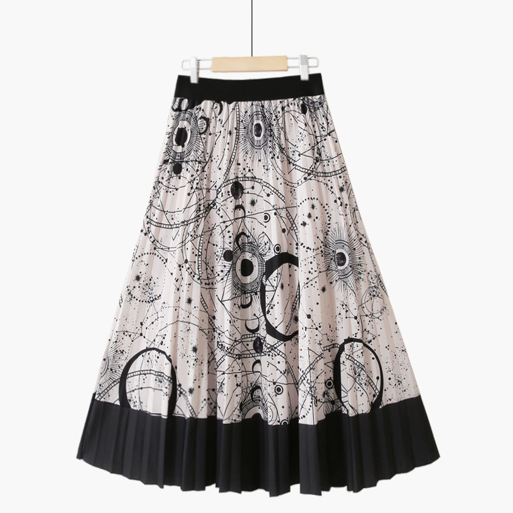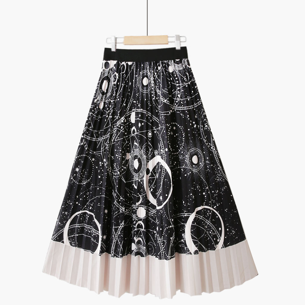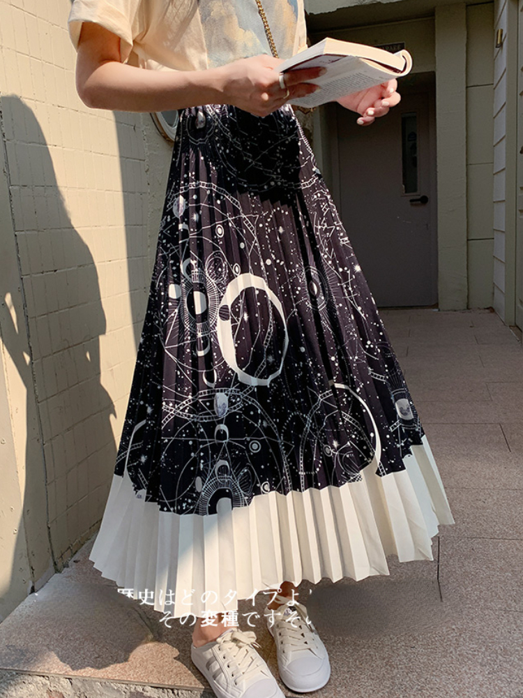 Summer Style Striped Pleated Long Skirts Galaxy Geometric Printed A-line Calf Swing Skirts