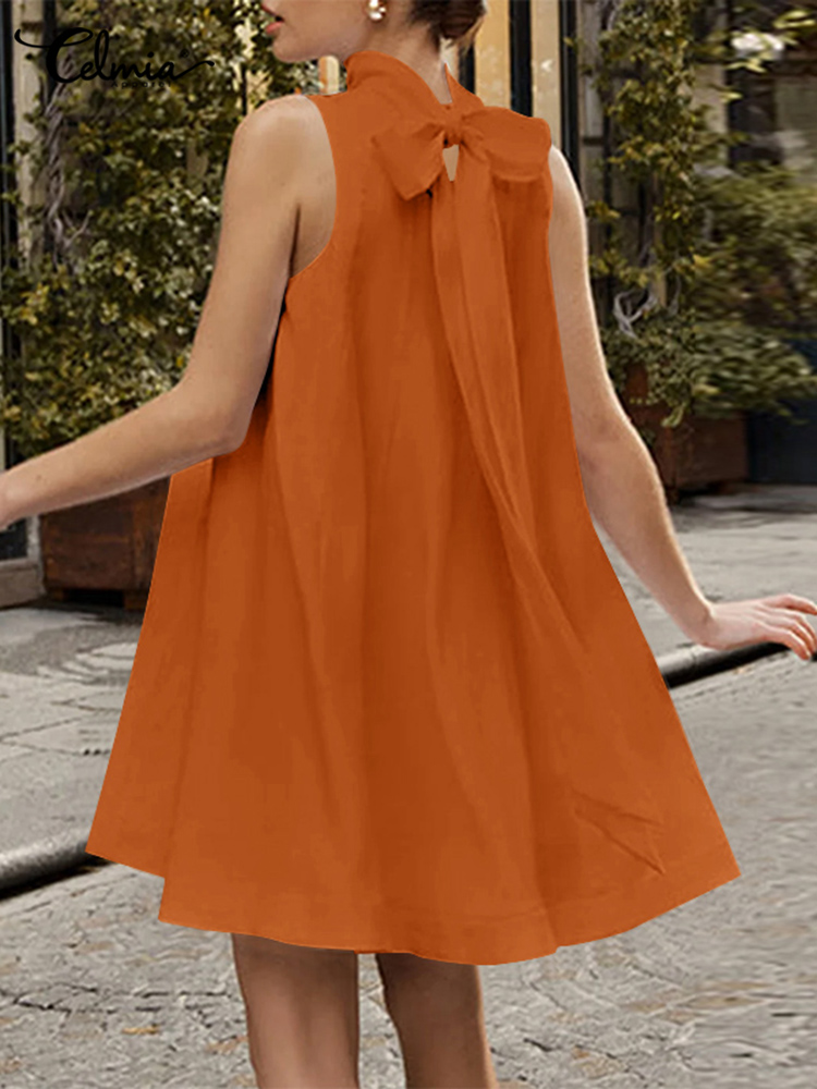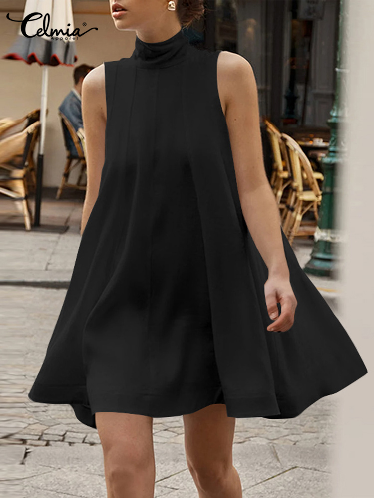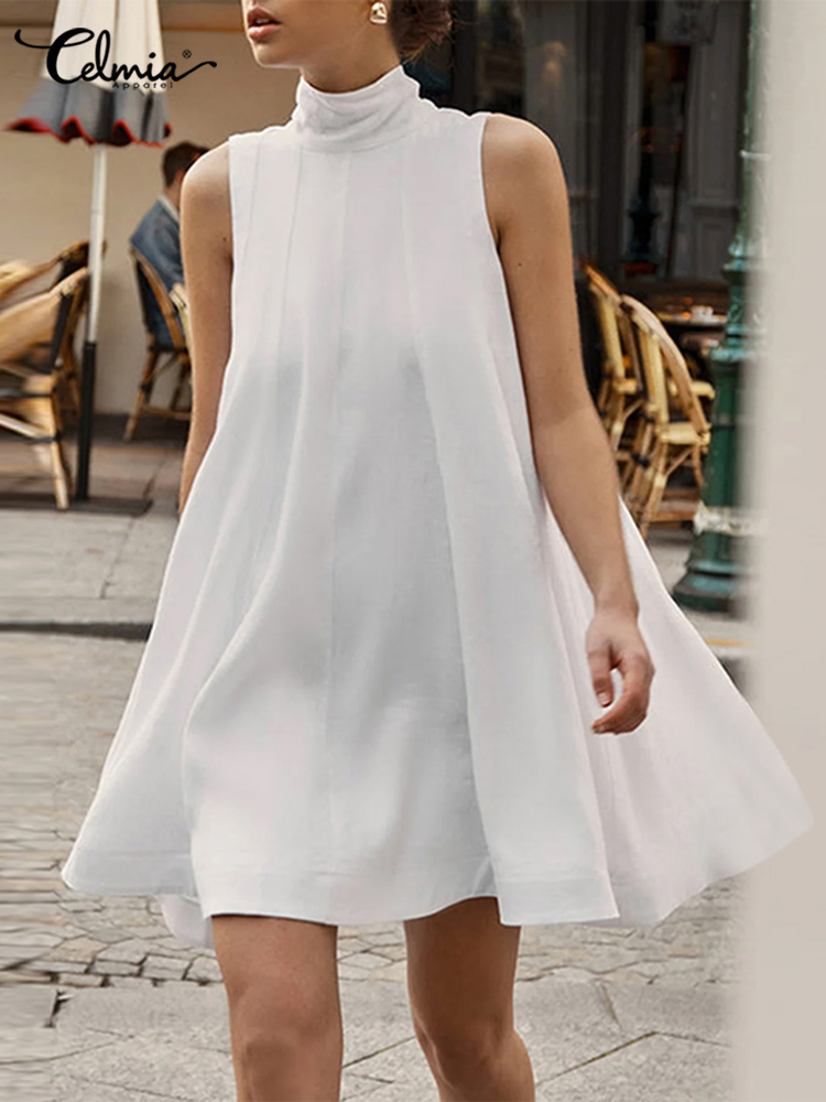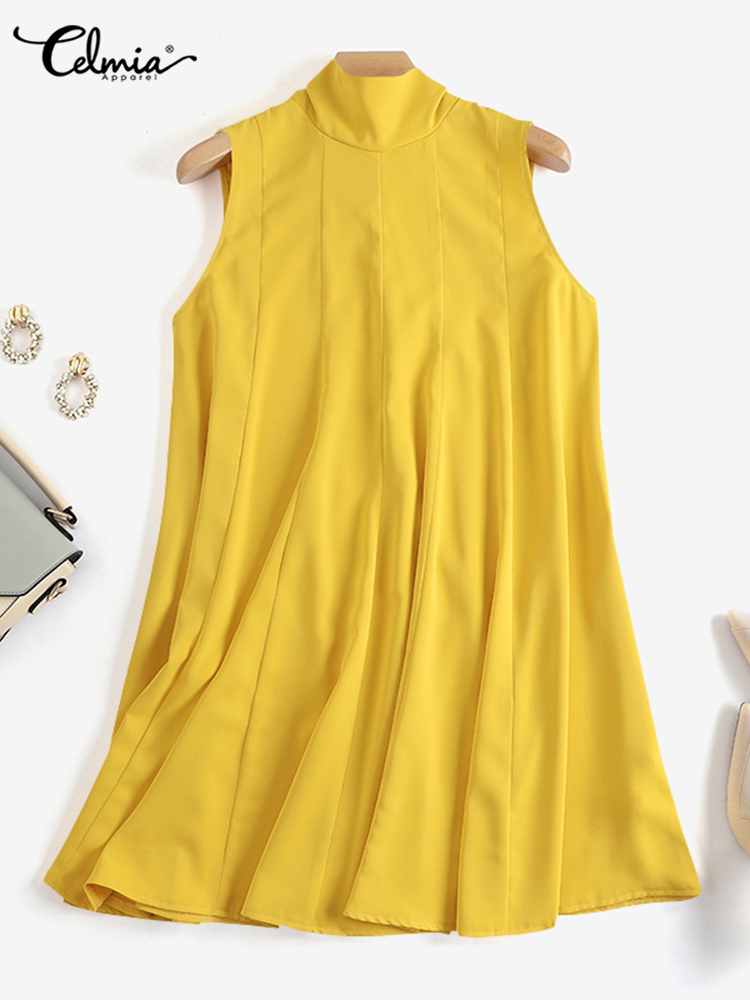 Summer Mini Dress Celmia Women Bandage High Collar Sundress Sleeveless A-line Tank Dress Streetwear Solid Pleated Robe