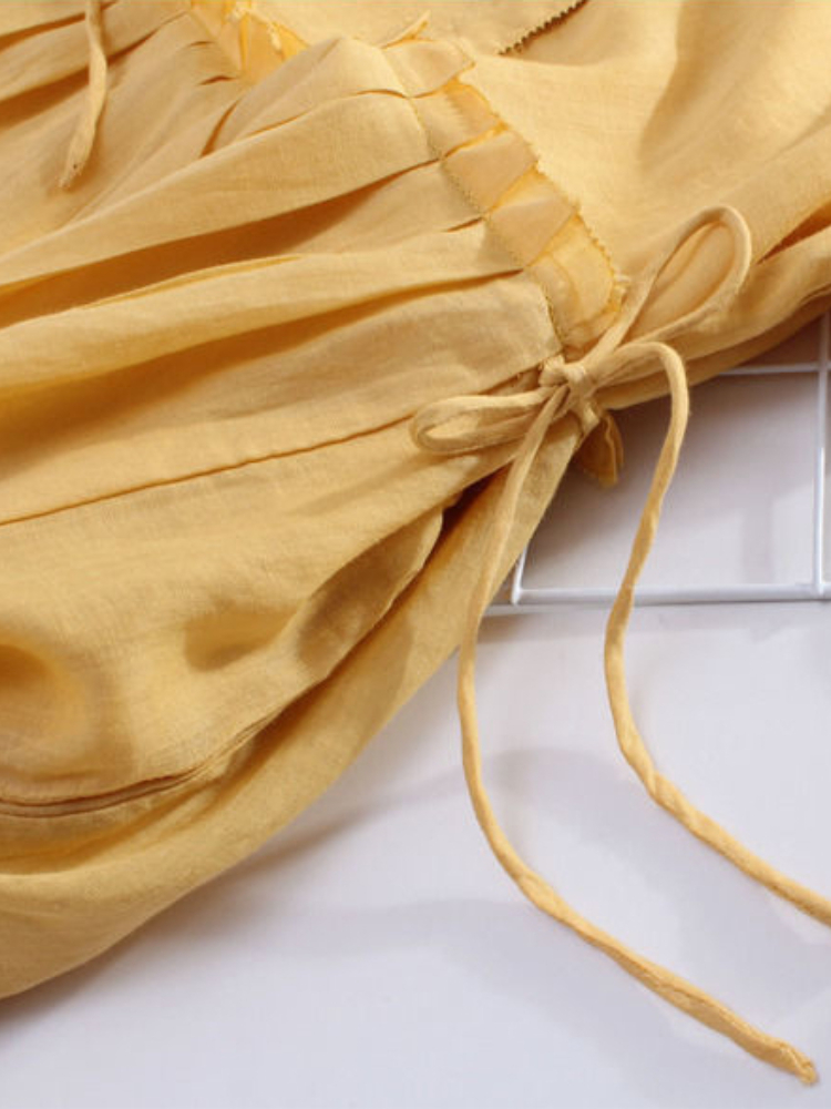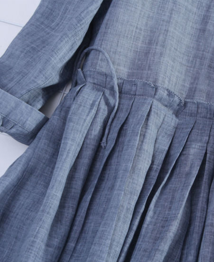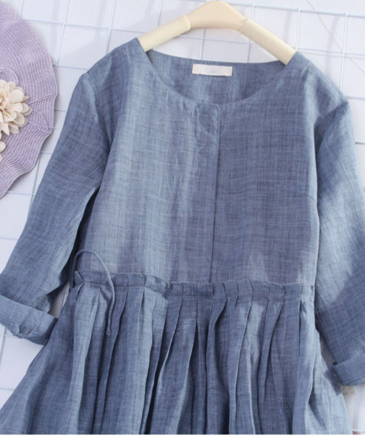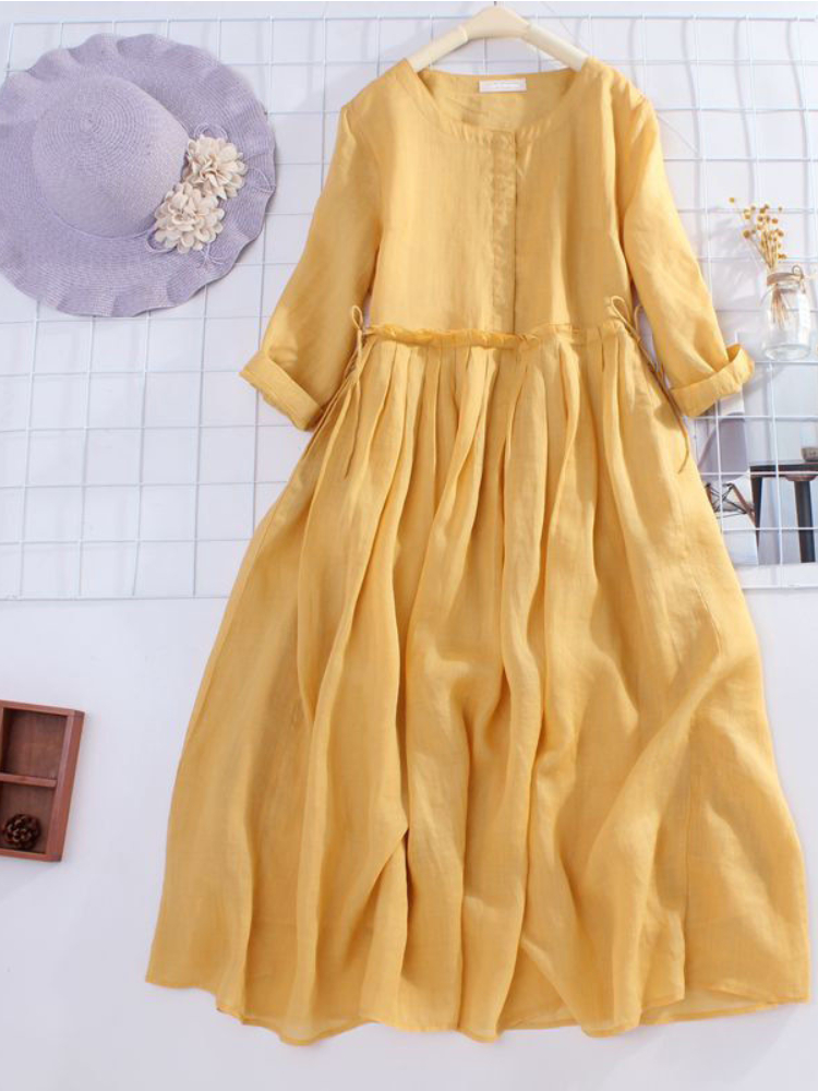 Summer Women's Dress Women's Clothing Literary Fan Cotton and Linen Waist Slim and Comfortable Round Neck Dress