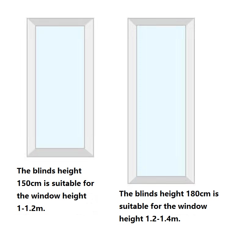 Friendly Reminder:When the blinds is straight,the length is the size on the specification,but because they got pleated,the size get shorter.So if your window's length is 150cm,you'd better to choose the length 180cm.Always remember longer is better.
