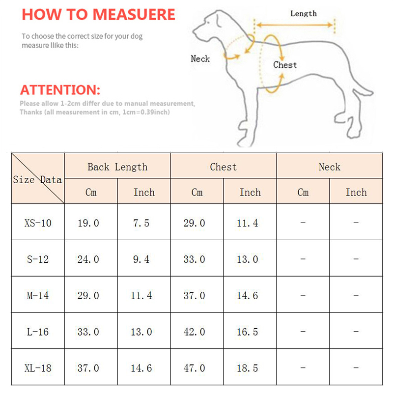 1.Pls kindly check your pet's measurements to make sure that the clothes fits pets before you order (1 Inch=2.54 Cm)