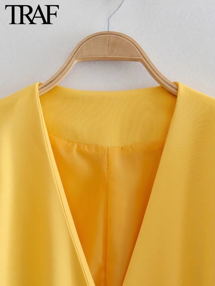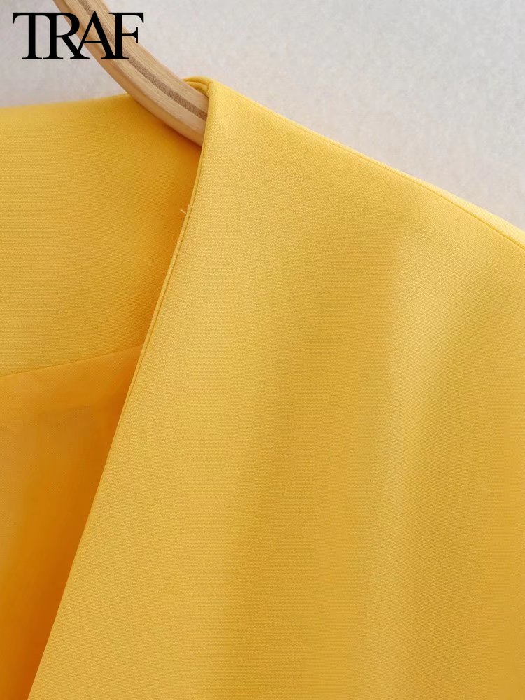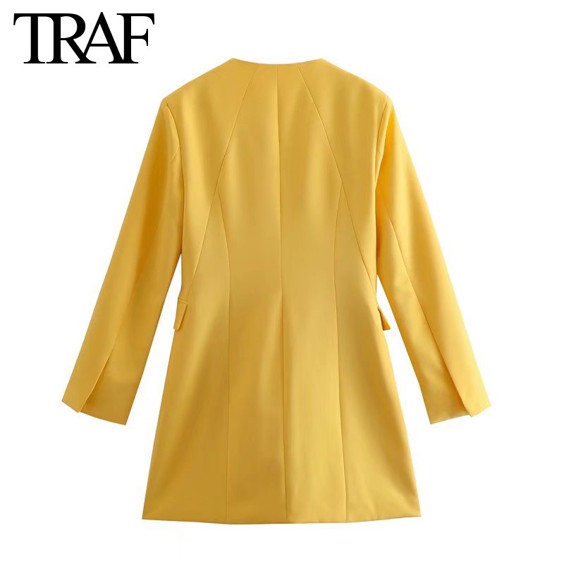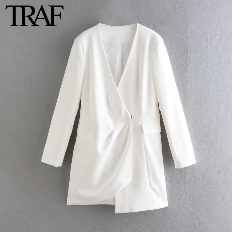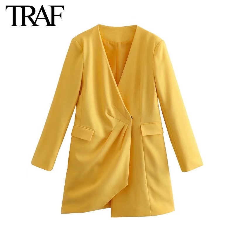 TRAF Women Fall Chic Office Lady Pleated Asymmetric Flap Pocket Blazers Dress Vestido Feminino