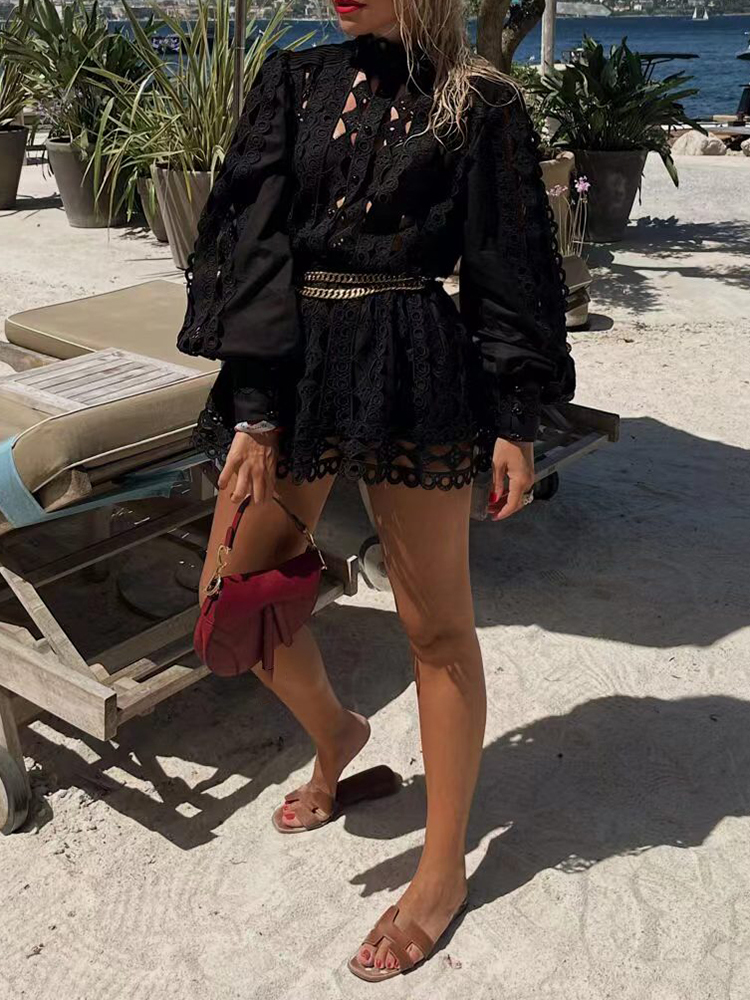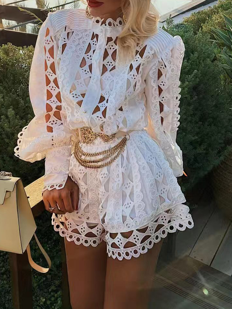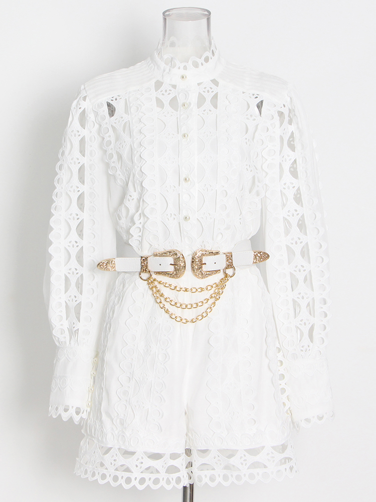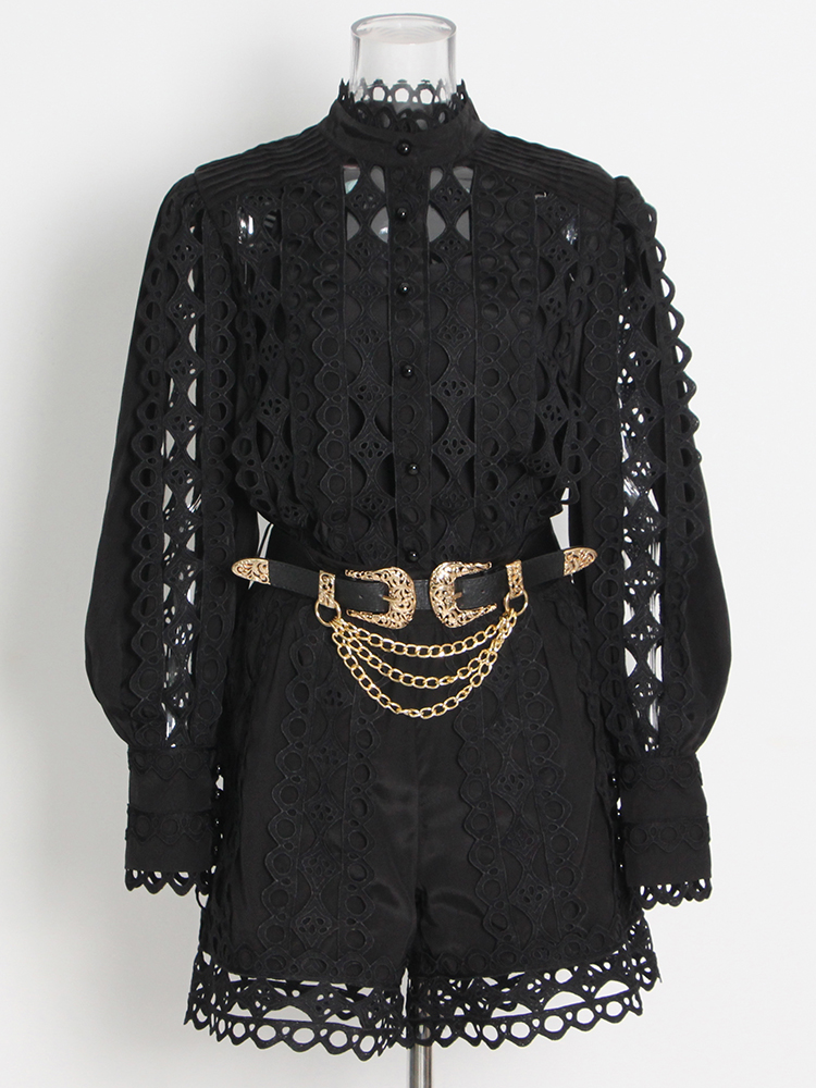 TWOTWINSTYLE Casual Solid Cut Out Two Piece Set For Women Stand Collar Long Sleeve Tops High Waist Shorts Female Sets Style