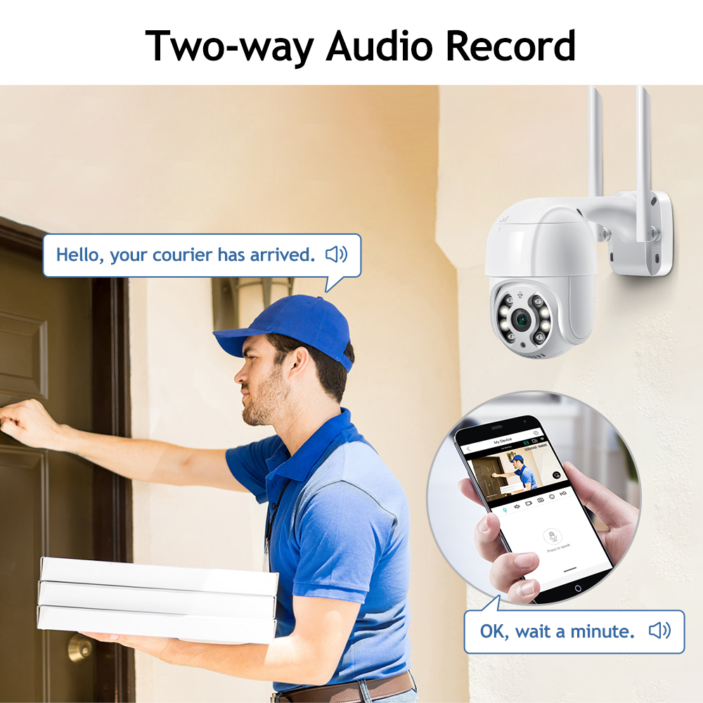 When someone breaks into shooting area, the camera will emits a sound to scare off intruders (customizable alarm sound). And it will push the alarm message to your mobile APP, then 4 white LED lights illuminate the intruder.