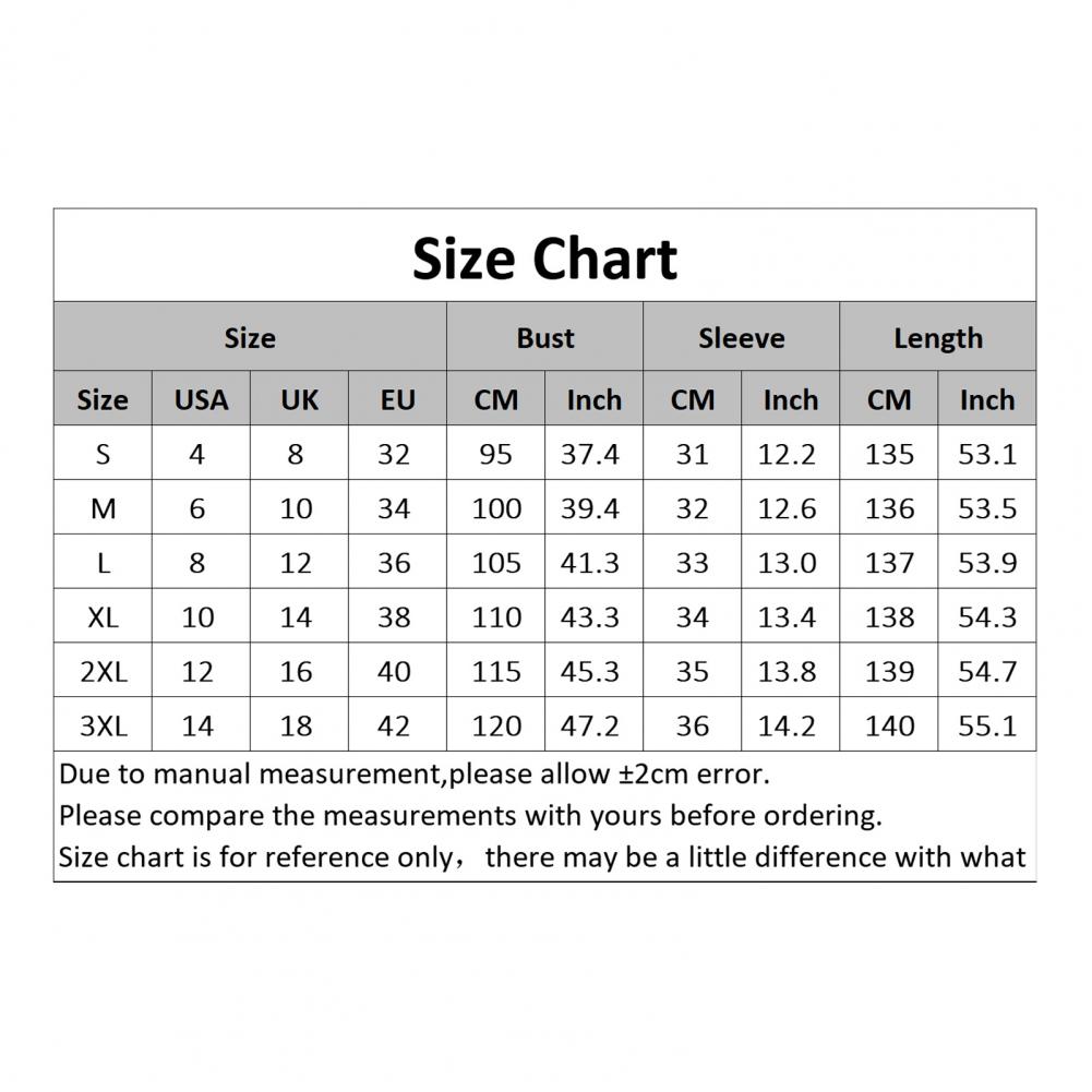 Size: 3XL, Bust: 120cm/47.2", Sleeve: 36cm/14.2", Length: 140cm/55.1" (Approx.)