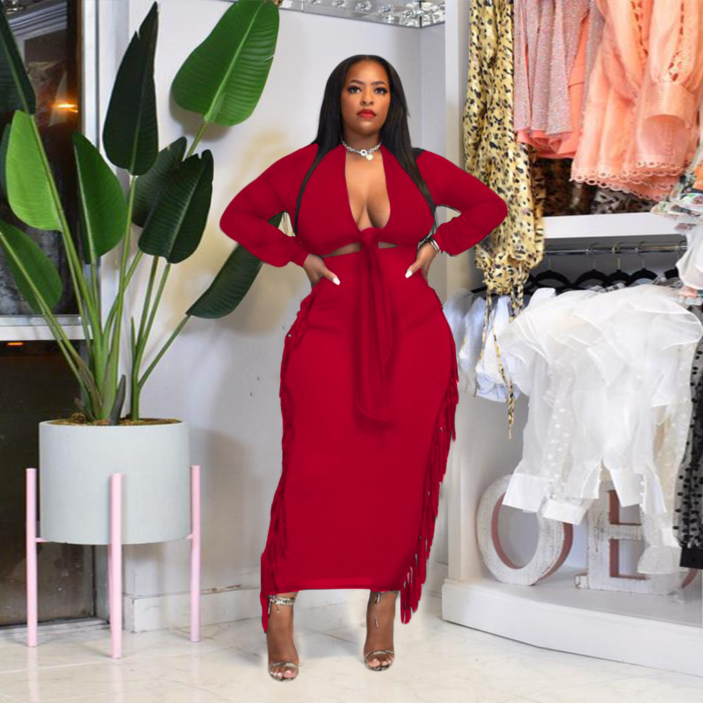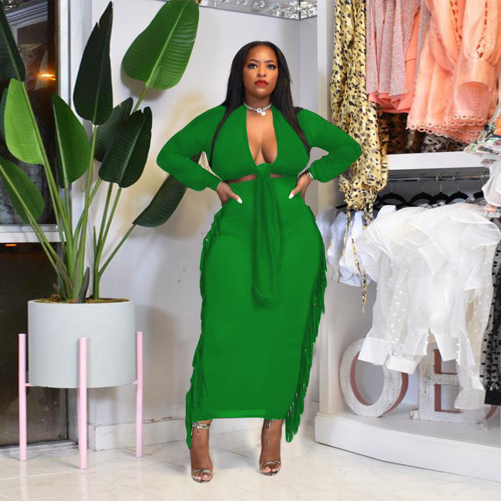 Vavcy spring autumn dress suit green t-shirt + wrinkle tassel sexy set
