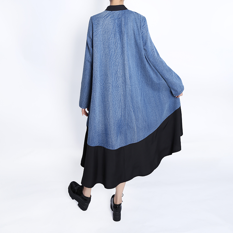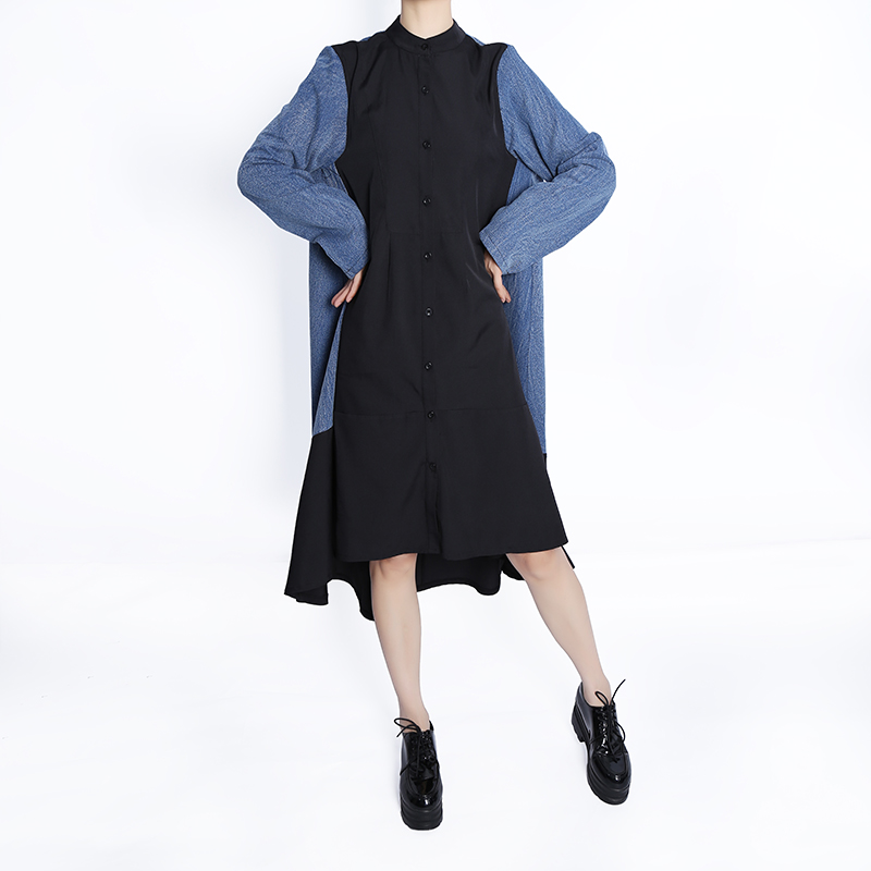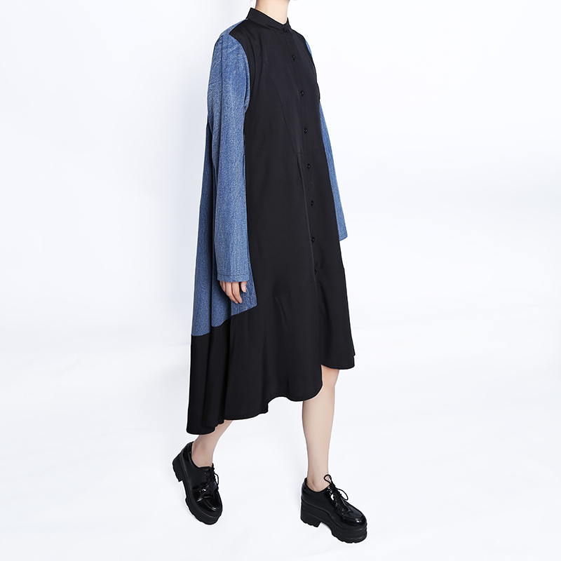 Very Big Size Woman Autumn Woman Long Sleeve Casual Wear Blue Black Denim Patchwork Dress Button Up Girls Unique Robe HU7728