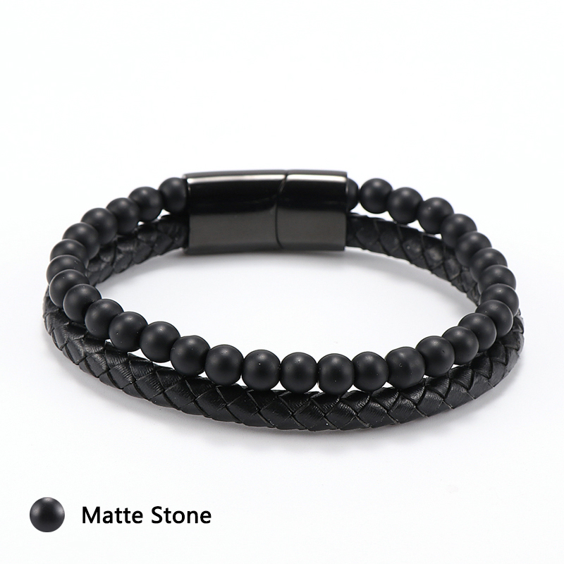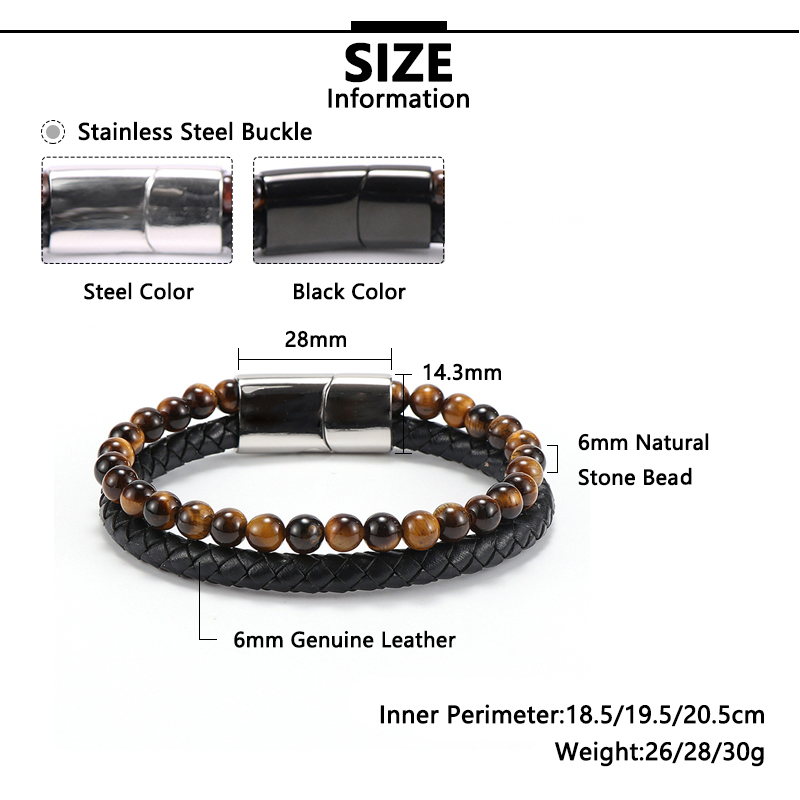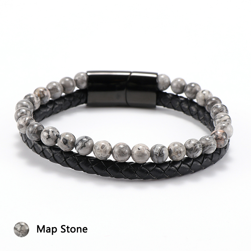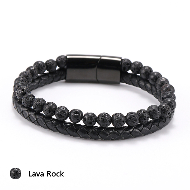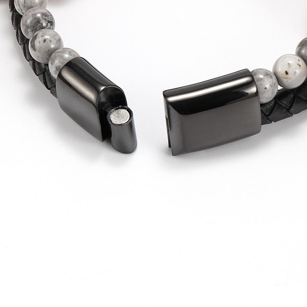 Item::Vintage Men's Jewelry Black Genuine Leather & Natural Stone Bead Bracelet Stainless Steel Magnetic Buckle Homme Wristband Bangle