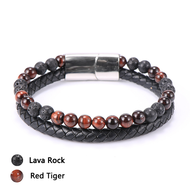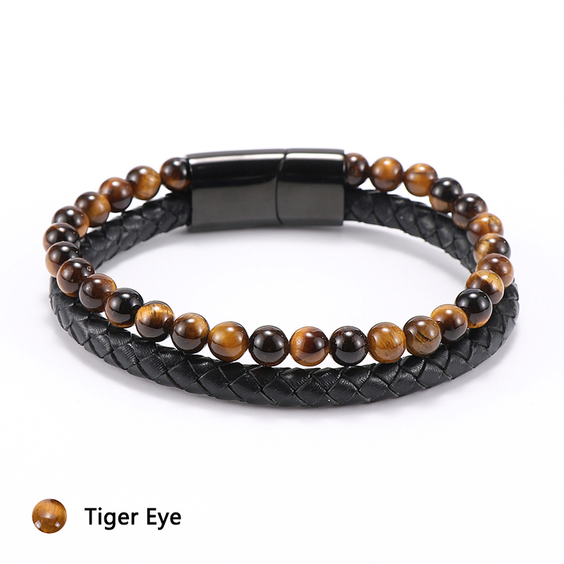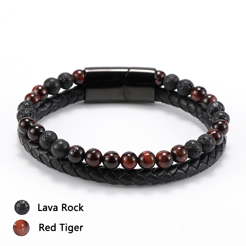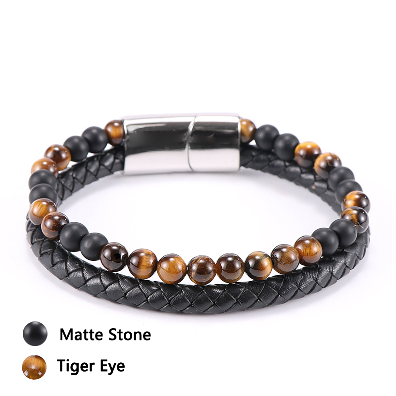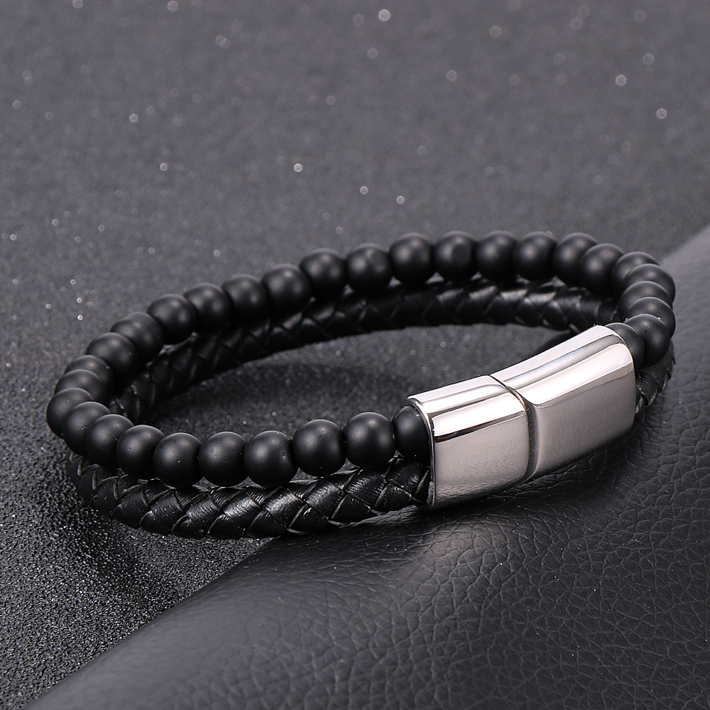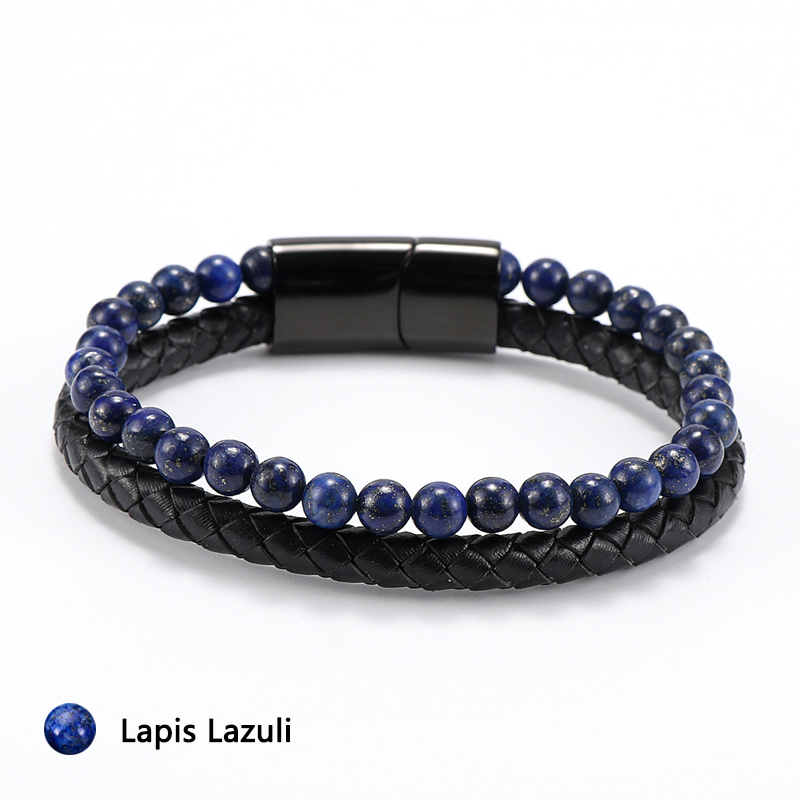 Item::Vintage Men's Jewelry Black Genuine Leather & Natural Stone Bead Bracelet Stainless Steel Magnetic Buckle Homme Wristband Bangle