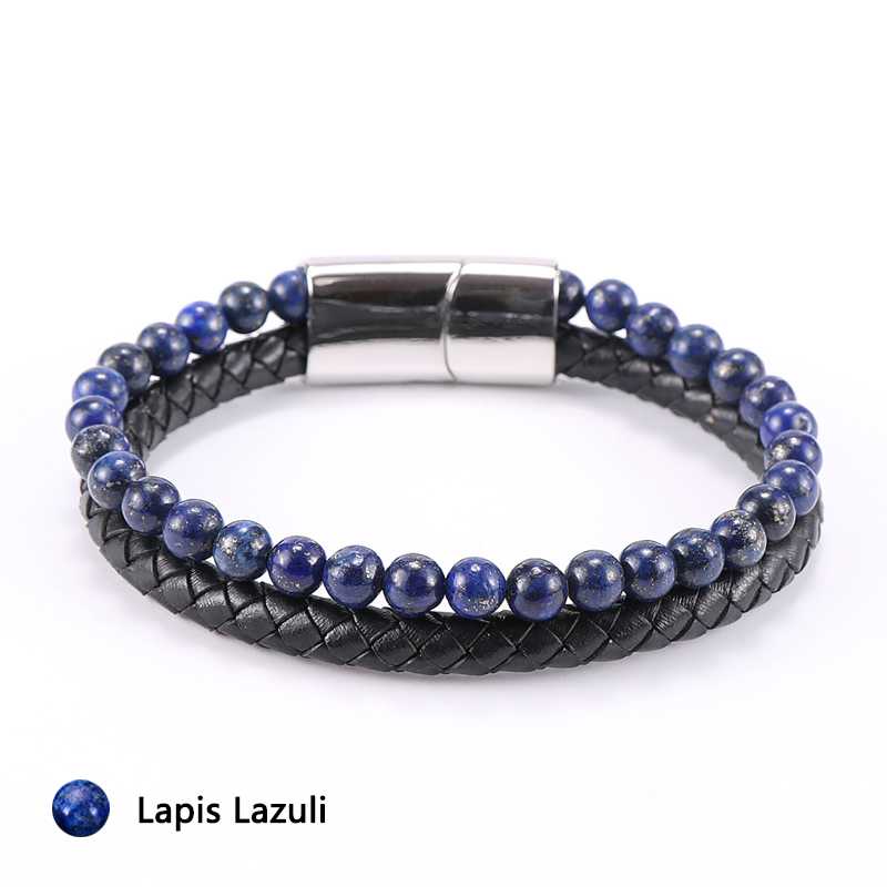Vintage Men's Jewelry Black Genuine Leather & Natural Stone Beads Wrap Bracelet Stainless Steel Magnetic Buckle Homme Twistband
