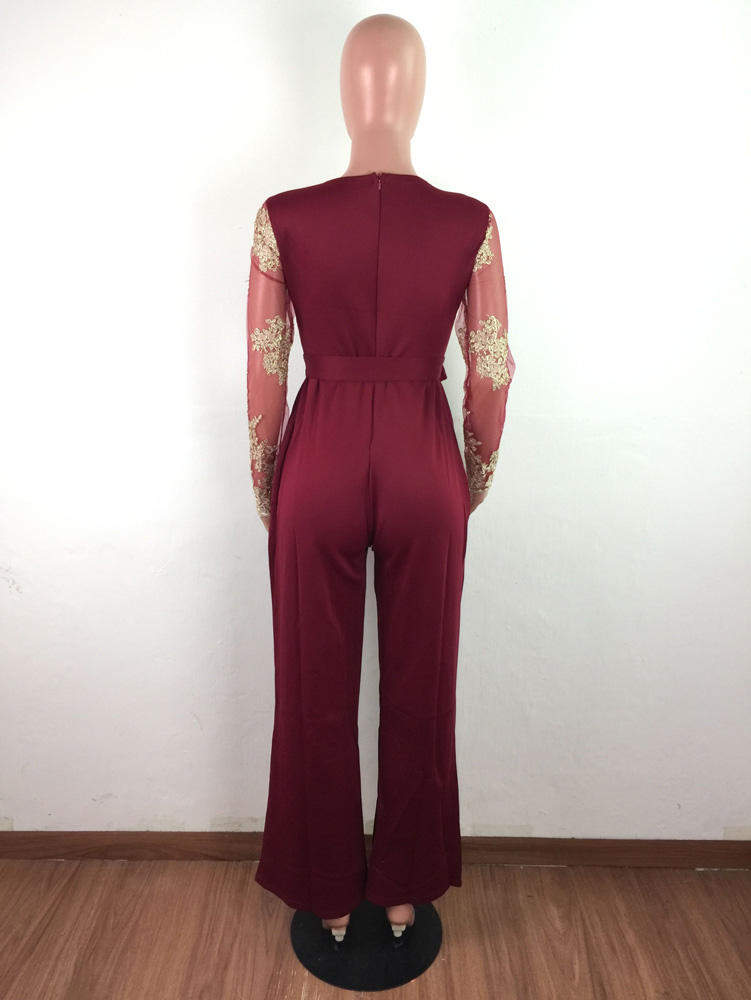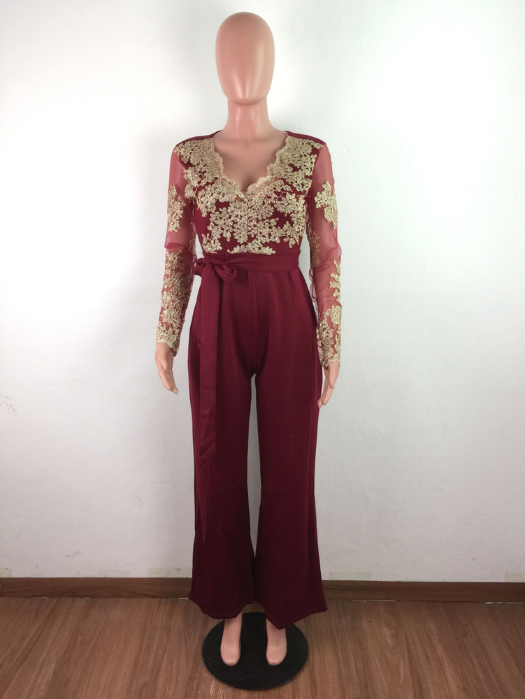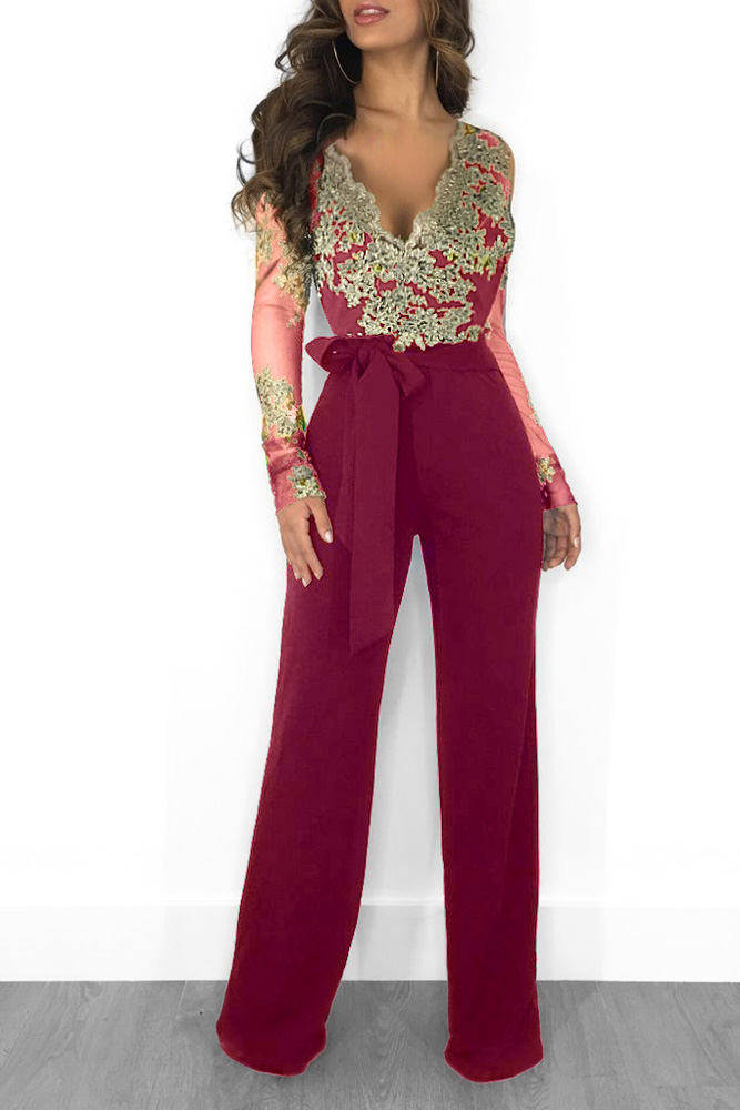 Wide Leg Casual Overalls Sexy Women V-neck Lace Elegant Straight Party Jumpsuit Rompers