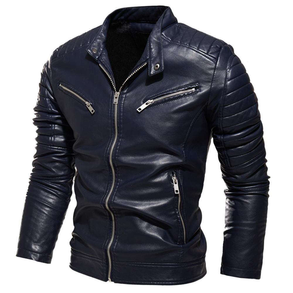 Winter Black Leather Jacket Men Fur Lined Warm Motorcycle Jacket Slim Street BLack Biker Coat Pleated Design Zipper
