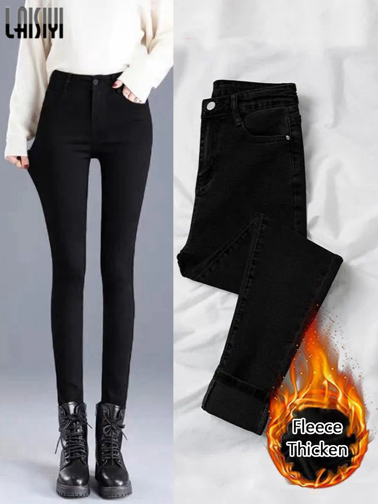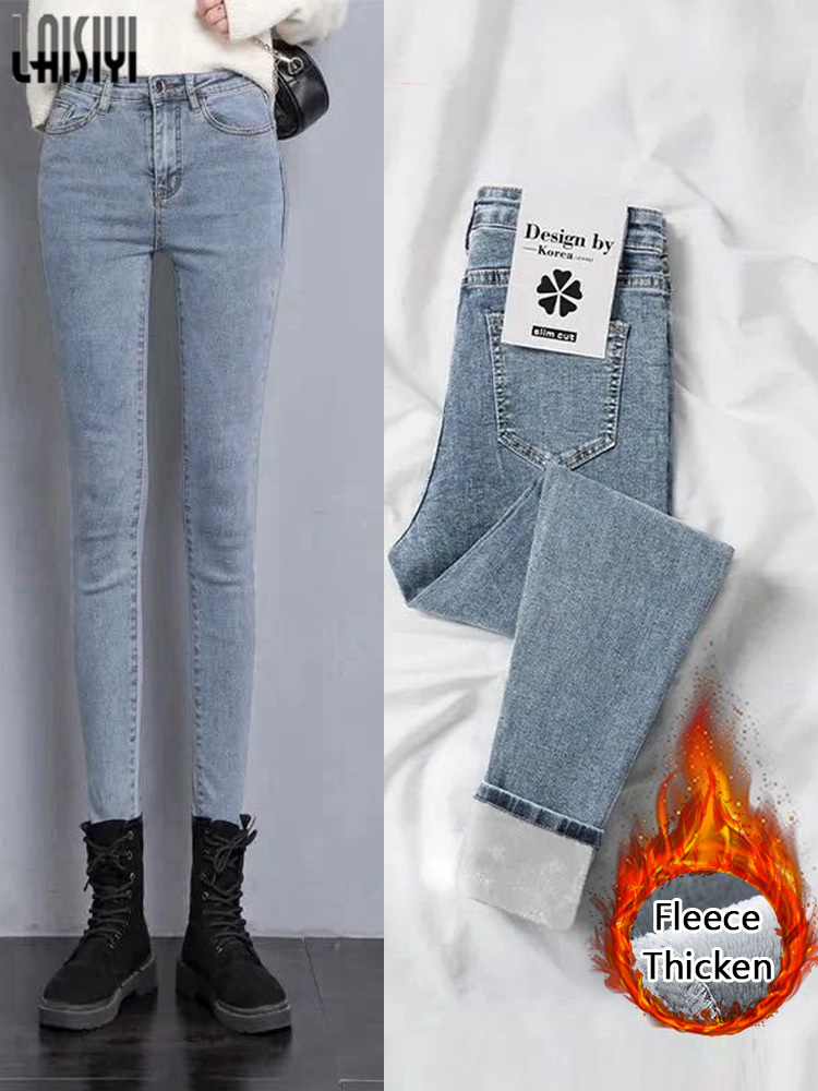 New Winter Thick Velvet Women High Waist Skinny Jeans Simple Fleece Warm Slim Fit Stretch Ladies Casual Denim Pencil Pants