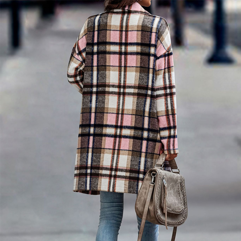Women Autumn Winter Pocket Plaid Warm Coats Casual Street Loose Long Sleeve Button Jackets Vintage Loose Cardigan Lapel Overcoat
