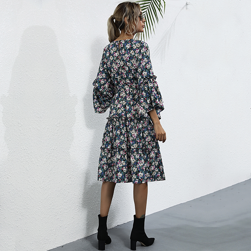 Women Elegant Cascade Ruffled Midi Dress Autumn O Neck Commute OL Shirt Dress Female Casual Holiday Dress Floral Dress