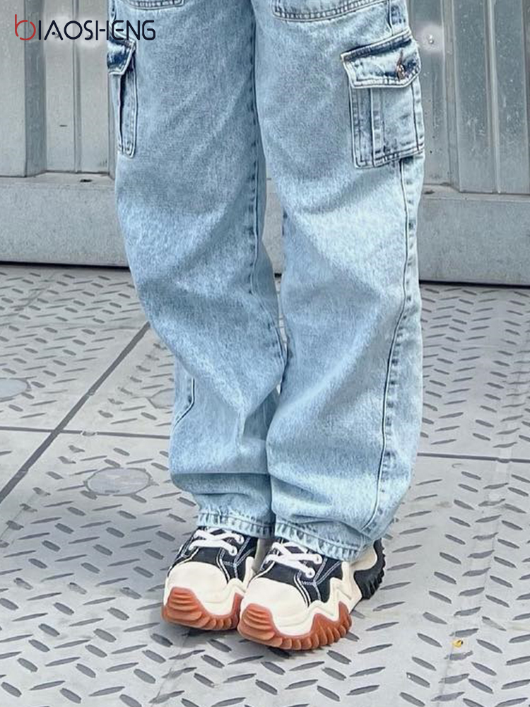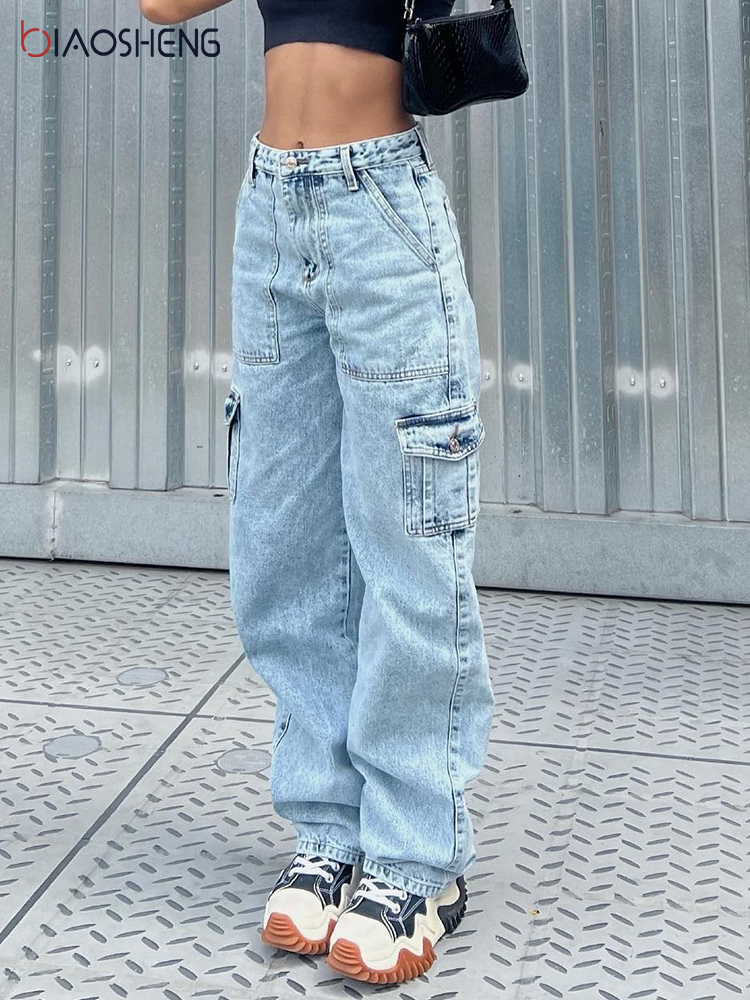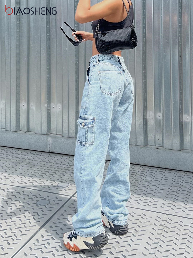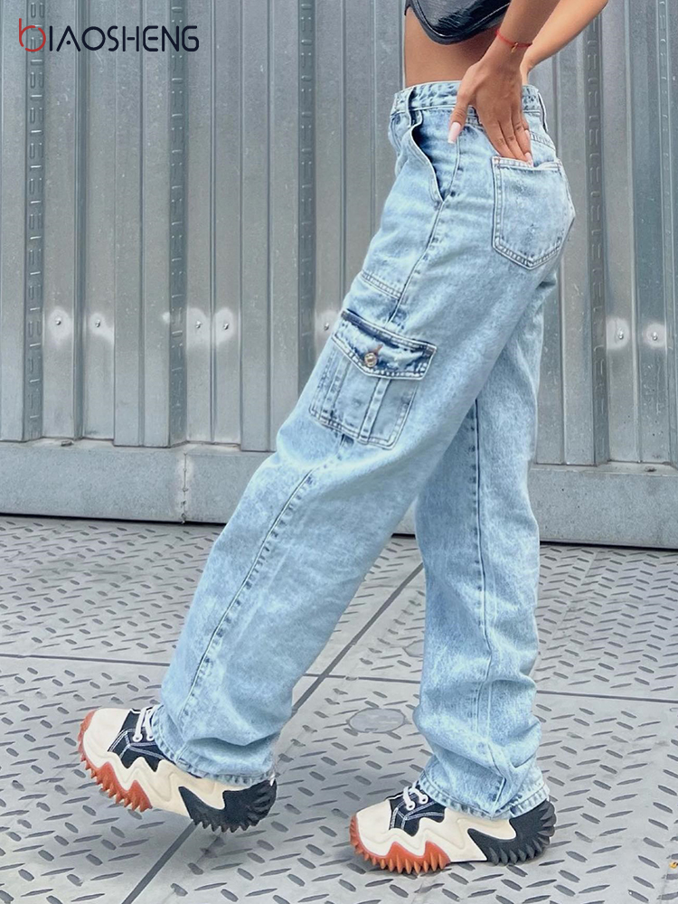 Women High Waist Baggy Jeans Flap Pocket Side Relaxed Fit Straight Wide Leg Cargo Jeans Slim Streetwear Boyfriend Jeans Trousers