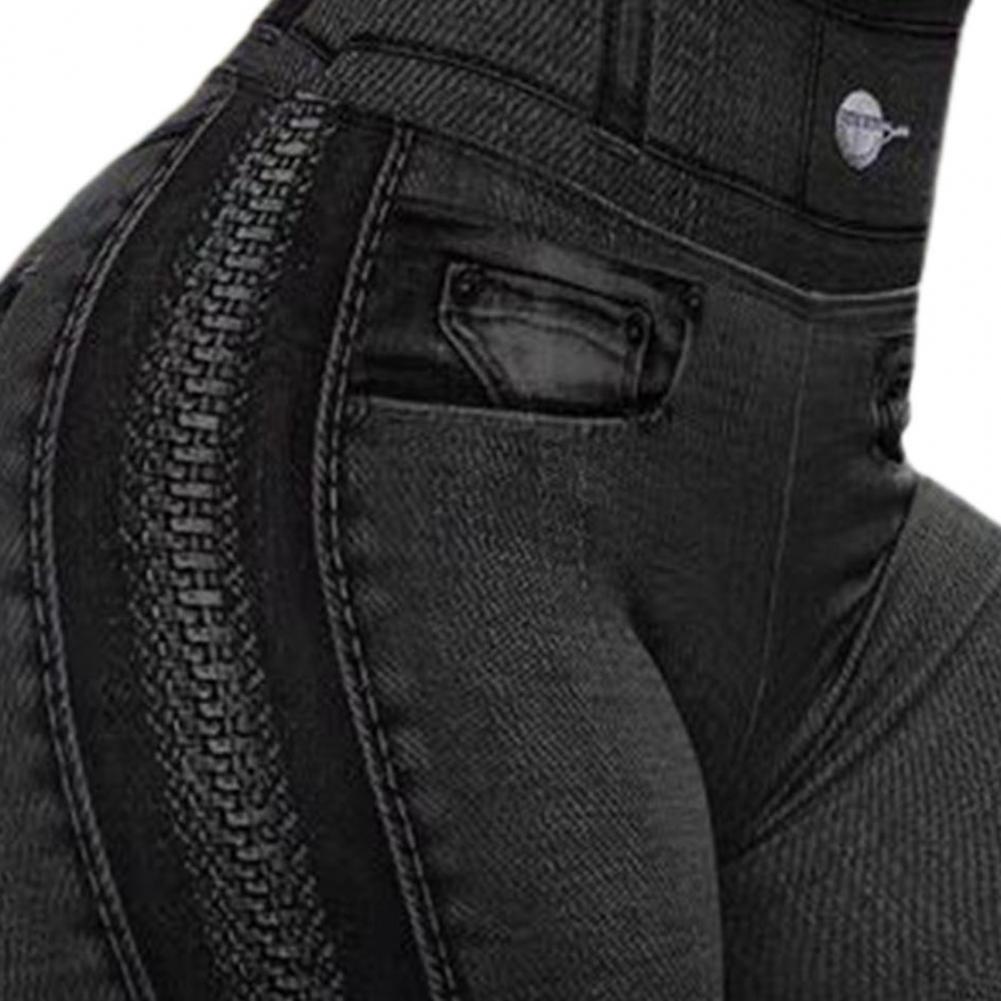 Decorative Pockets Skinny Imitation Jeans Leggings Hip Lifting Zipper Print High Waist Elastic Pants for Sports