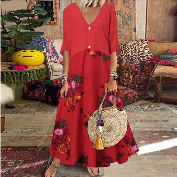 Women Stiching Sundress Elegant Summer Shirt Dress Half Sleeve Printed Maxi Vestidos Female V Neck Robe