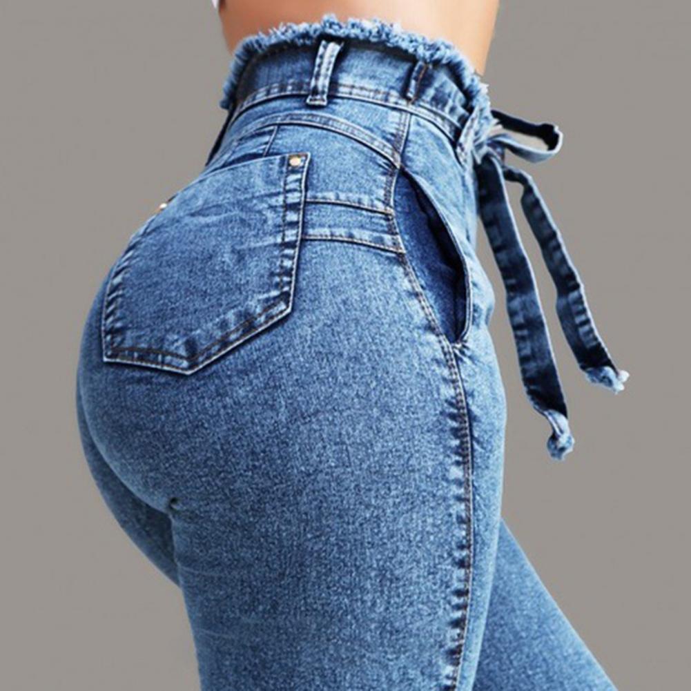 High Waist Multi Pockets Women Jeans Slim Tassel Bandage Push Up Denim Pants Trousers