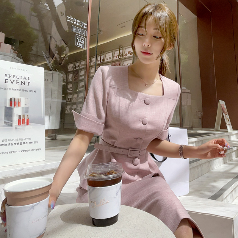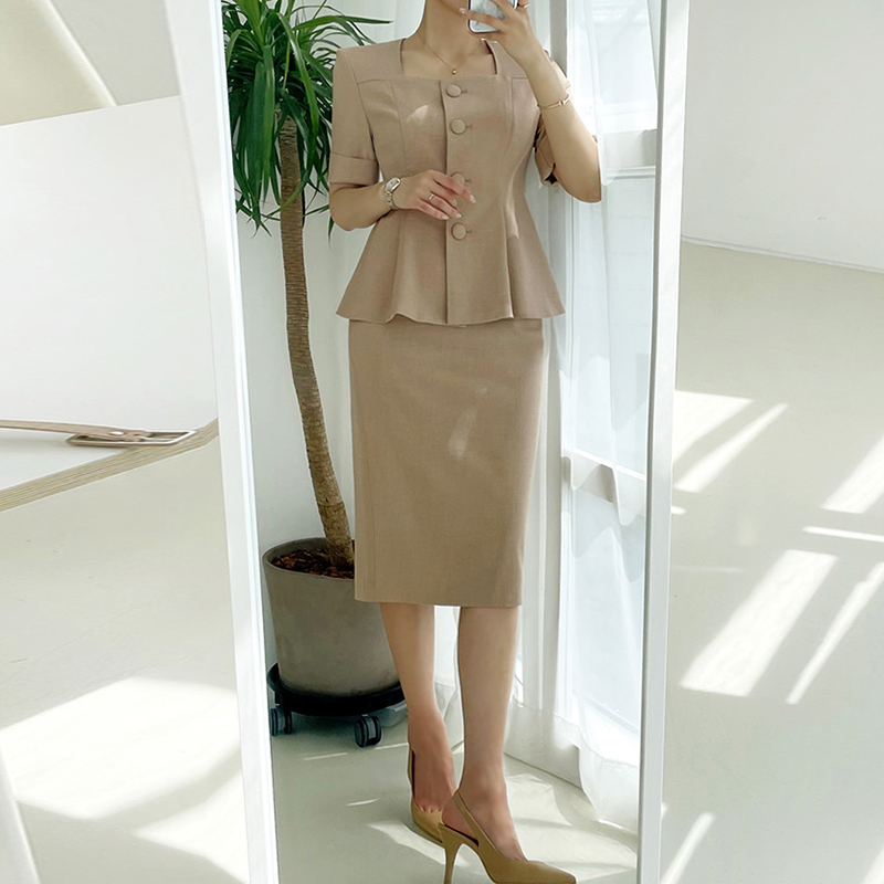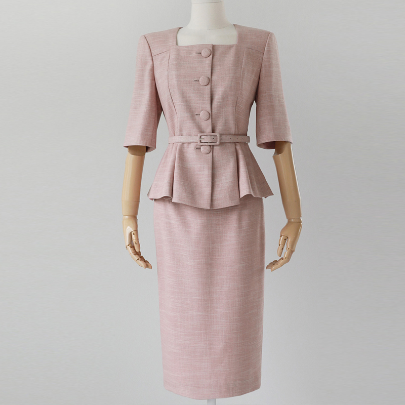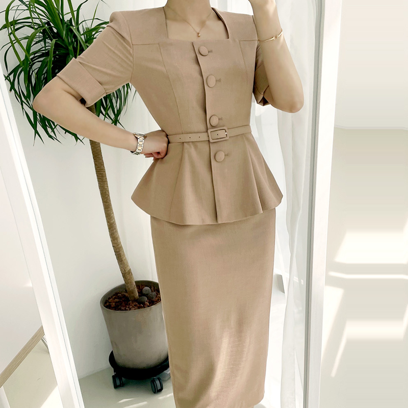 Women's Office Suit Short Sleeve Slim Belt Take Waist Blazer Top + Mid Pencil Skirts Suits 2 Piece Set