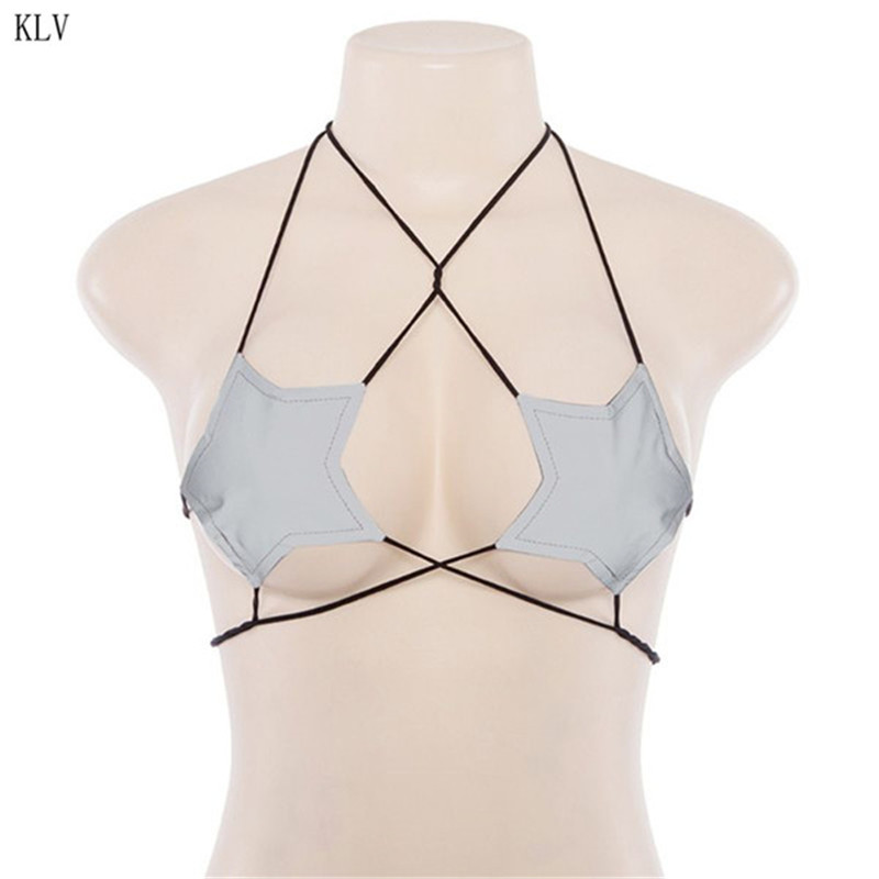 Womens Sexy Glitter Reflective Five-Pointed Star Bra Strappy Bandage Halter Top Bralette Nightout Clubwear Metallic Bustier Party Bandeau
