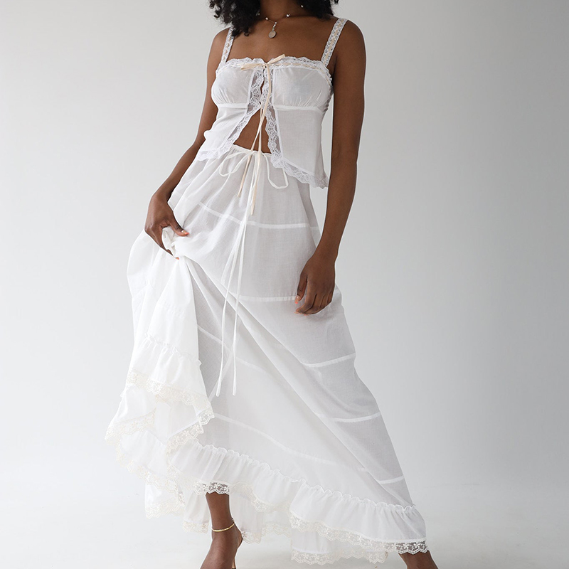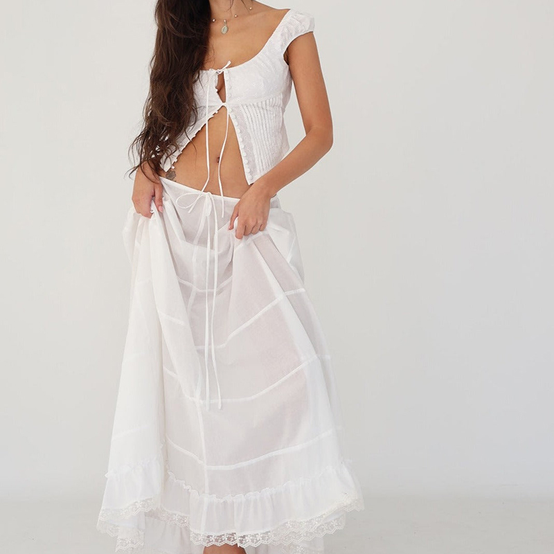 Y2K Fairycore Retro Two Piece Set Women Button Up Lace Trim Milkmaid Tank Crop Top + White Loose Ruffles Skirts Vintage Outfits