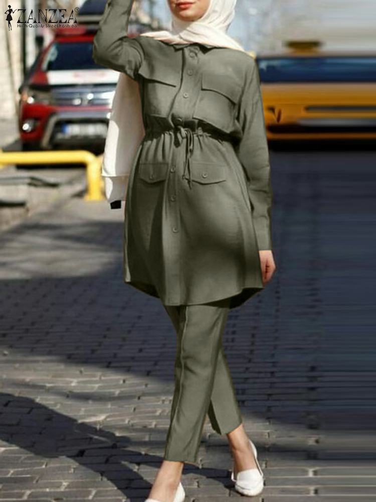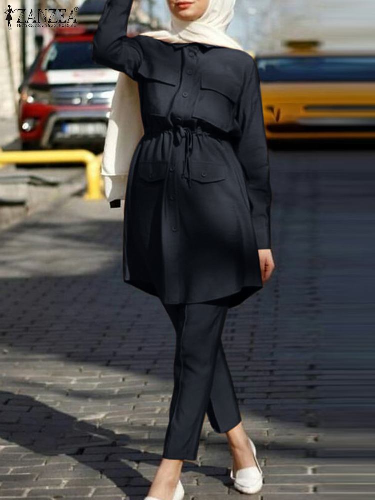 ZANZEA Casual Party Sets Abaya Kaftan Women Islamic Clothing Muslim Suit Solid Color Lapel Tunic Tops Drawstring Pant