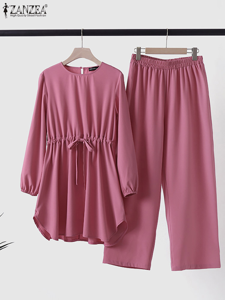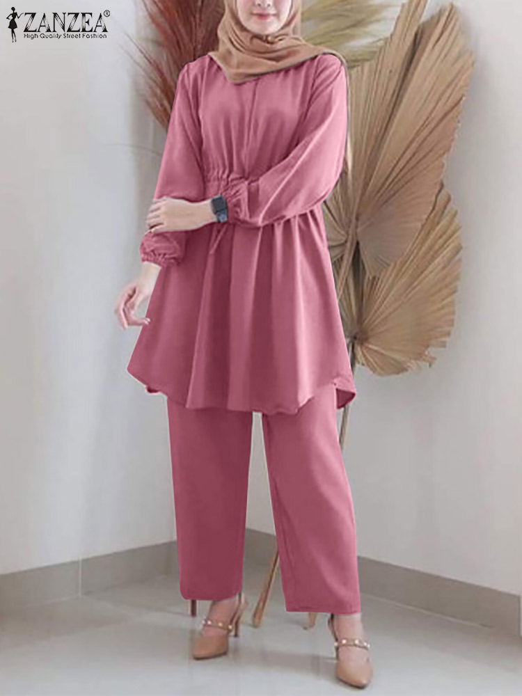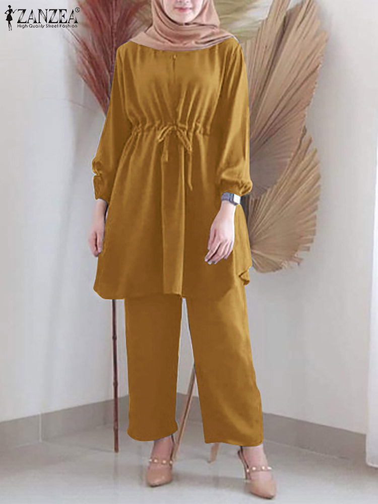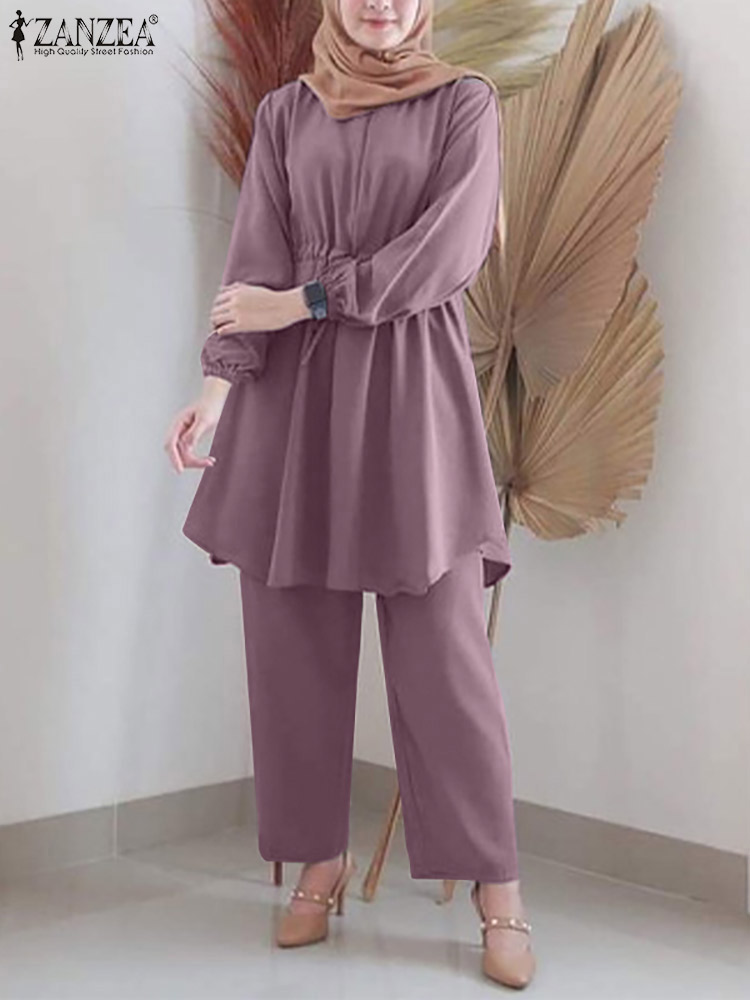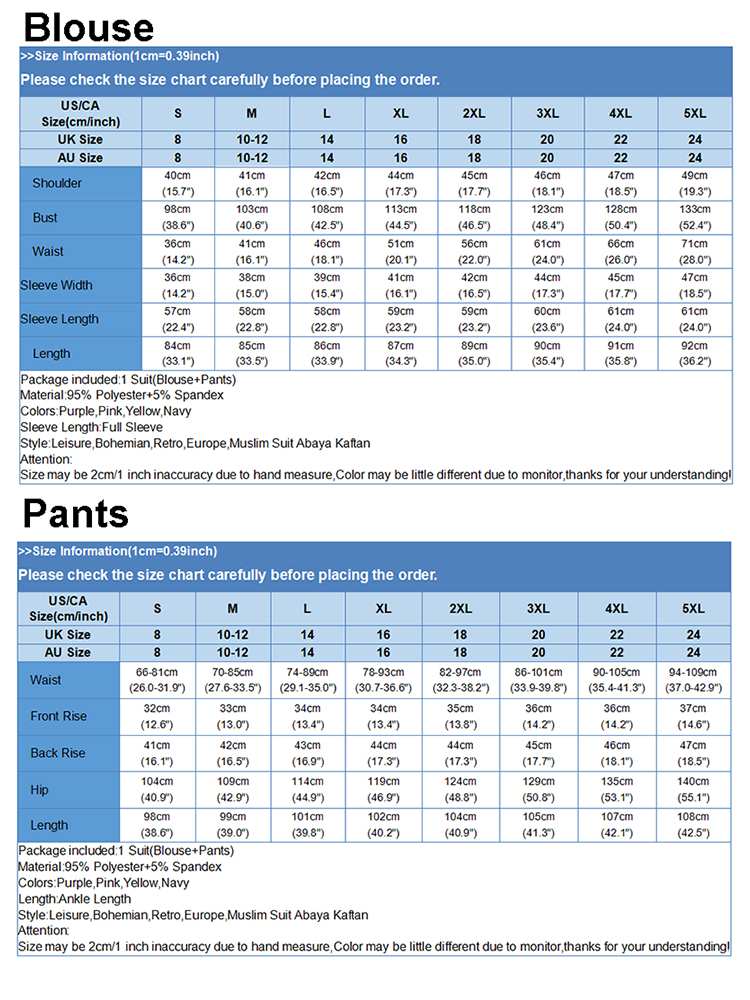 | Package included:1 Suit(Blouse+Pants) Material:95% Polyester+5% Spandex Colors:Purple,Pink,Yellow,Navy Sleeve Length:Full Sleeve Neckline:O-Neck Pattern:Solid Color Length:Ankle Length Buckle chain:Buttons on the back Thickness:Thin Features:Drawstring waist Style:Leisure,Bohemian,Retro,Europe,Muslim Suit Abaya Kaftan Season:Spring,Summer,Autumn,Winter Occasion:Family,Party,Beach,Wedding,Holiday,Employment Attentions: 1.The Real Object May Exist Slightly Colors Differences Compared To Images As Different Computers Display.Caution If Minding,Thanks. 2.There Might Be A Manual Measuring 1-3 cm Error.Sorry For Any Inconvenience. 3.Please Prevail On Real Item, Model Images For Reference Only. 4.Attention!!!Please check the size chart carefully before placing the order. Blouse Pants