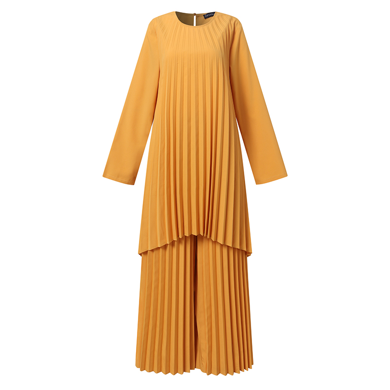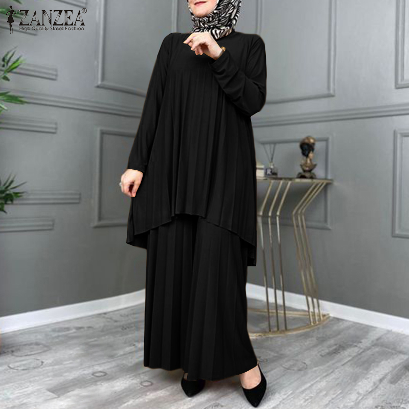 ZANZEA Women Muslim Sets Islamic Clothing Plain Suits Morocco Turkish Pleated Full Sleeve Tops Wide Legs Long Pants Oversized