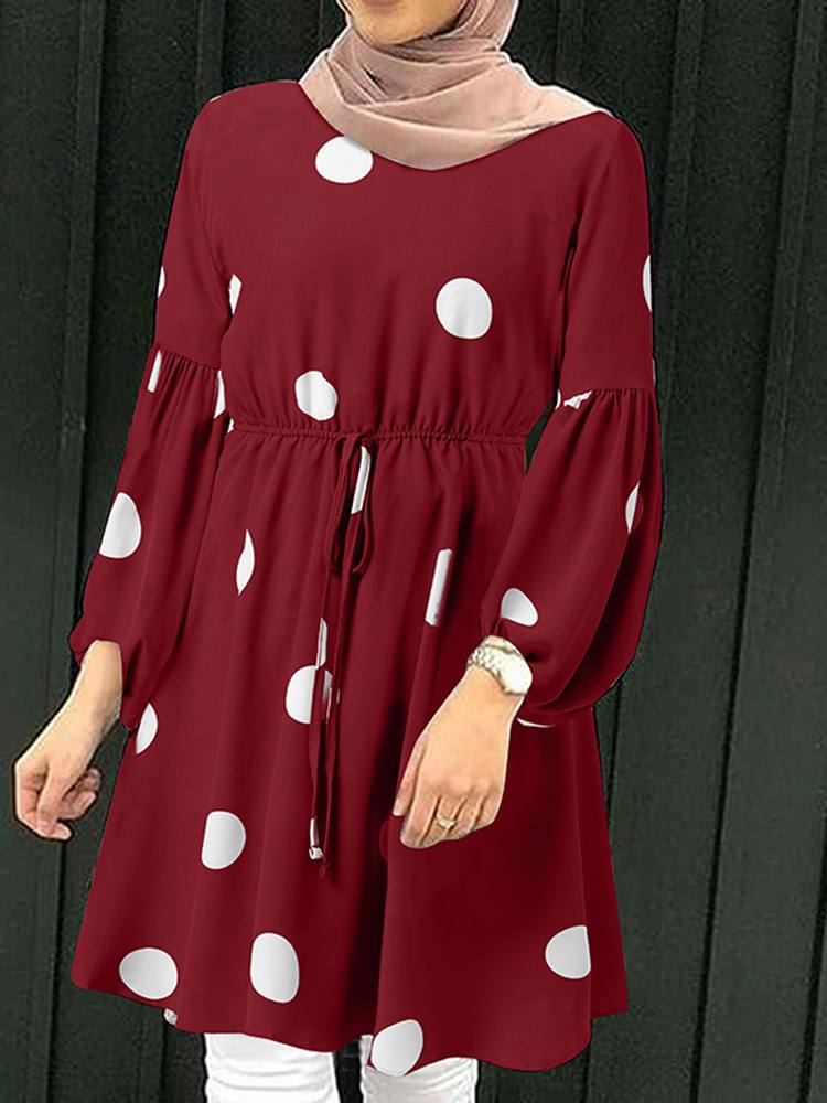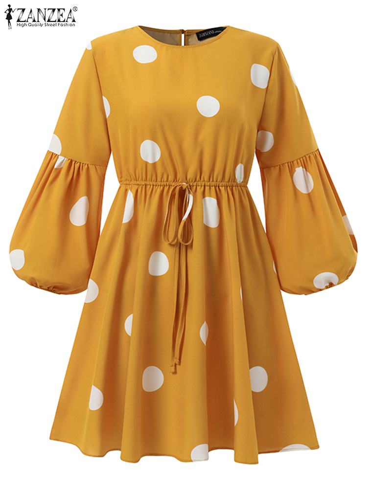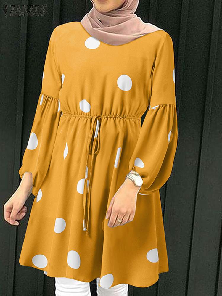ZANZEA Women Polka Dots Printed Muslim Blouse Lace-Up Puff Sleeve Islamic Clothing Elagant Casual Dubai Marocain Turkish Tops