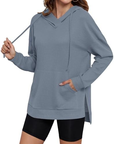AUSELILY Womens Waffle Hoodies Ladies 2024 Sweatshirt Fall Long Sleeve Loose Side Slits Stacked V Neck Tops With Pockets