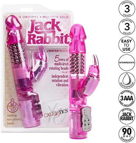 "This Waterproof Jack Rabbit is ready for every steamy dip or sexy adventure with 3 intense vibration speeds and 3 rumbling rotation speeds powered by 5 rows of rotating beads. To maximize and customize your pleasure, use the easy-touch control pad to independently operate the variety of vibration and rotations options. This versatile Jack Rabbit is a daring option for beginners and perfectly thrilling for the erotically experienced. Whether you’re looking to step into the tub for some sensual solo time or turn the heat up in the shower with a lover, this lucky rabbit is ready.