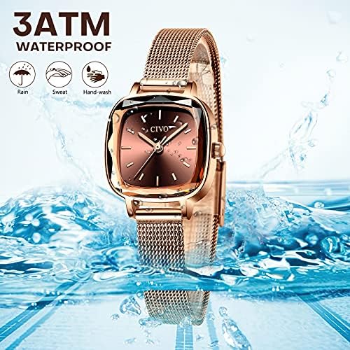 Attractive watch that so far (2 months) has kept time perfectly.I found the instructions for adjusting the band unclear but was able to figure it out by examining the latch. There are no links to remove. Instead, one half of the latch can be pried open to slide along the band, which has small grooves to help keep it from slipping once its pressed closed. However, I found it difficult to align these grooves. The band hasn't slipped, but the excess band is still there. It's not exactly in the way but in my case (I have very small wrists), moving the latch left a long tail that's a little awkward and has to be tucked under the strap when closed. It's also still a little too big but the difficulty of trying to align the grooves has so far deterred me from trying to get a better fit. Since the band is not elastic, it probably needs to be a little loose anyhow which allows the watch to rotateFor the price though, it looks great and I love that I don't need to remove it to wash dishes