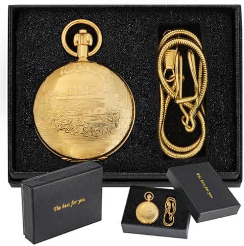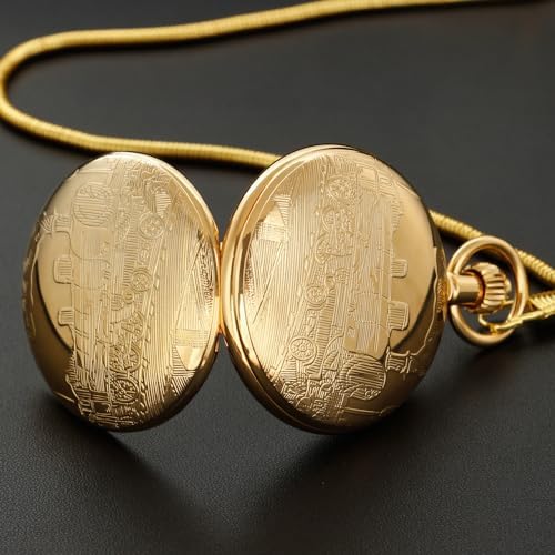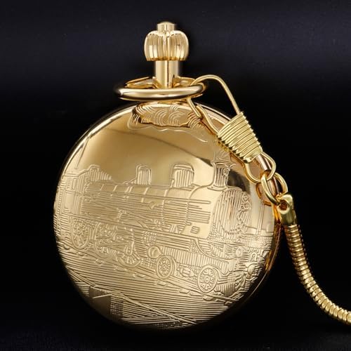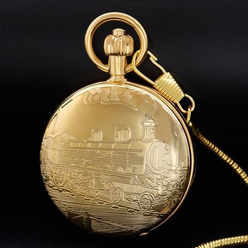 Copper Pocket Watch Train Railroad Case Mechanical Men's Pocket Watch Roman Numerals Hand Wind Pocket Watch with Chain&Box